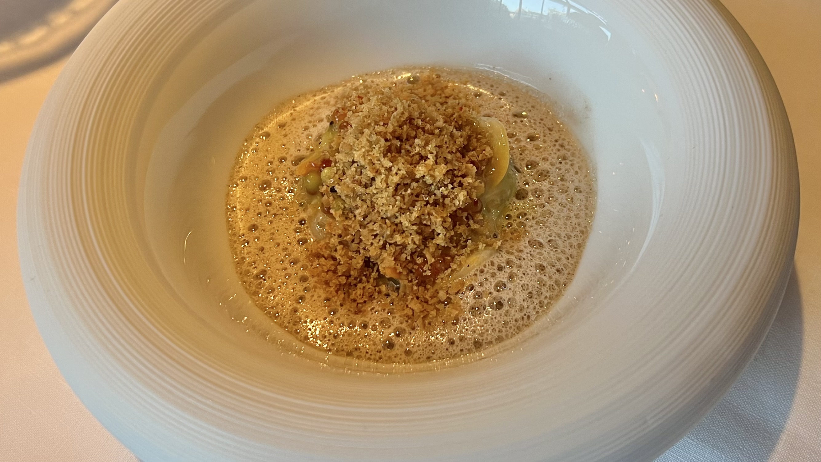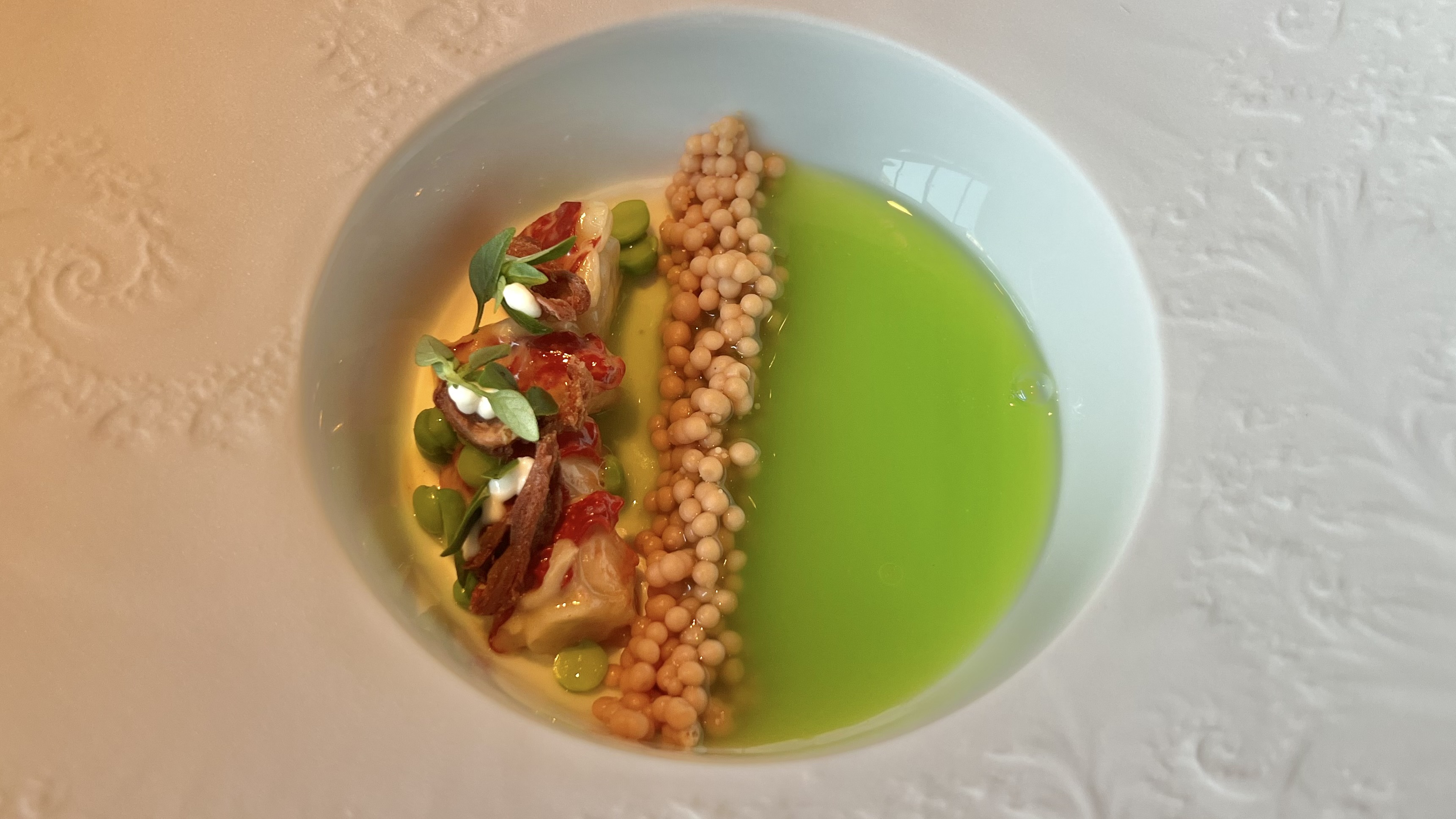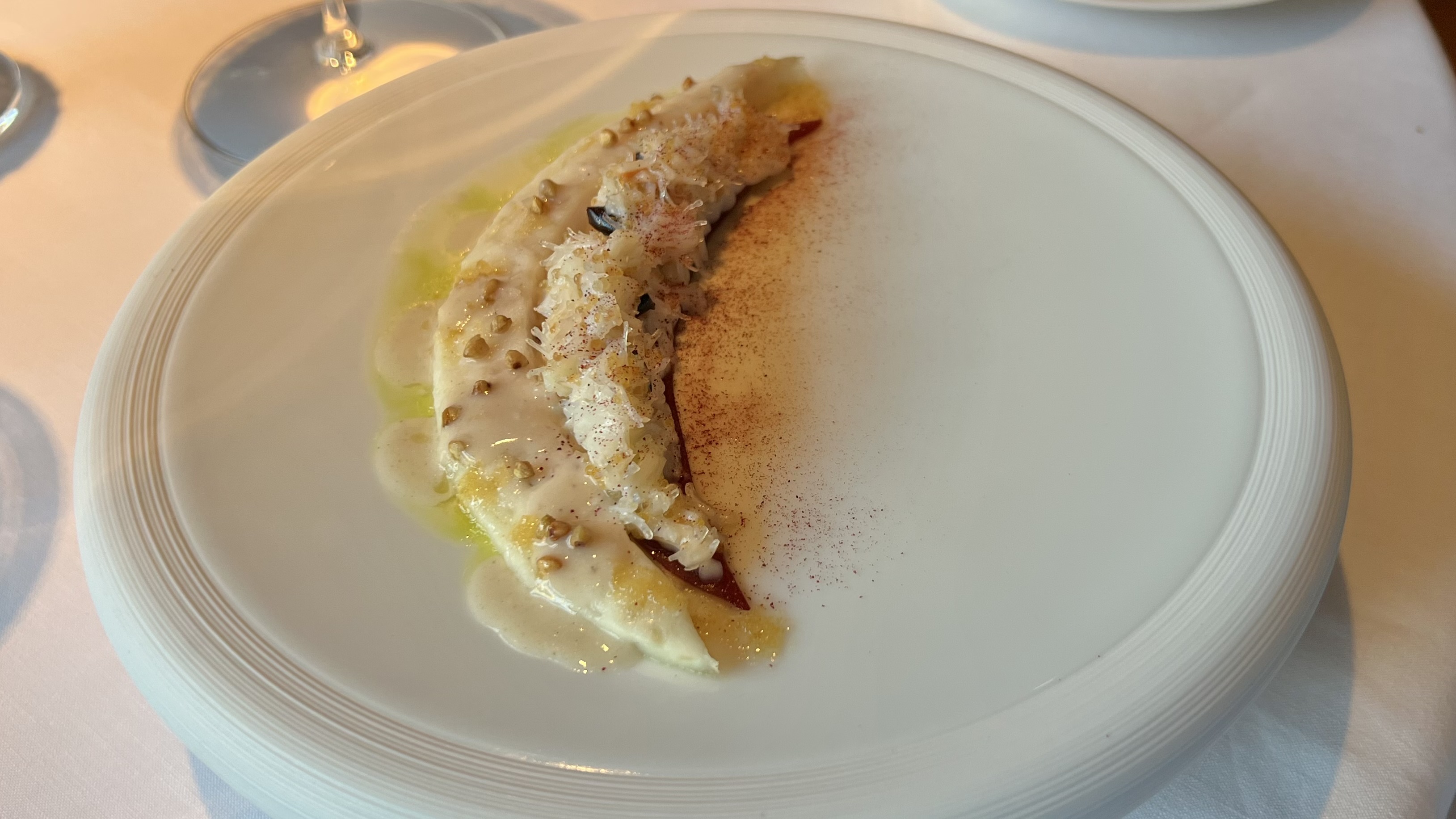 The second course was Blue Lobster with duck tongue, licorice, pearls of foie gras, and green apple ‘jus’. Another marvelous combination of textures and flavors; I especially enjoyed the duck tongue that was crispy and at the same time had a very nice duck flavor. The wine had a bruised apple character (think of a grated apple you’ve left until it turns brown) but with a creamy texture. Thus it worked with the creamy lobster and foie gras as well as with the apple jus. The sommelier said this was a case of 1+1=3, but I said it was more like 0.5 + 1 = 2.5, as I would never drink this wine on its own, but with the dish it was indeed very enjoyable and brought out the flavors of the dish.