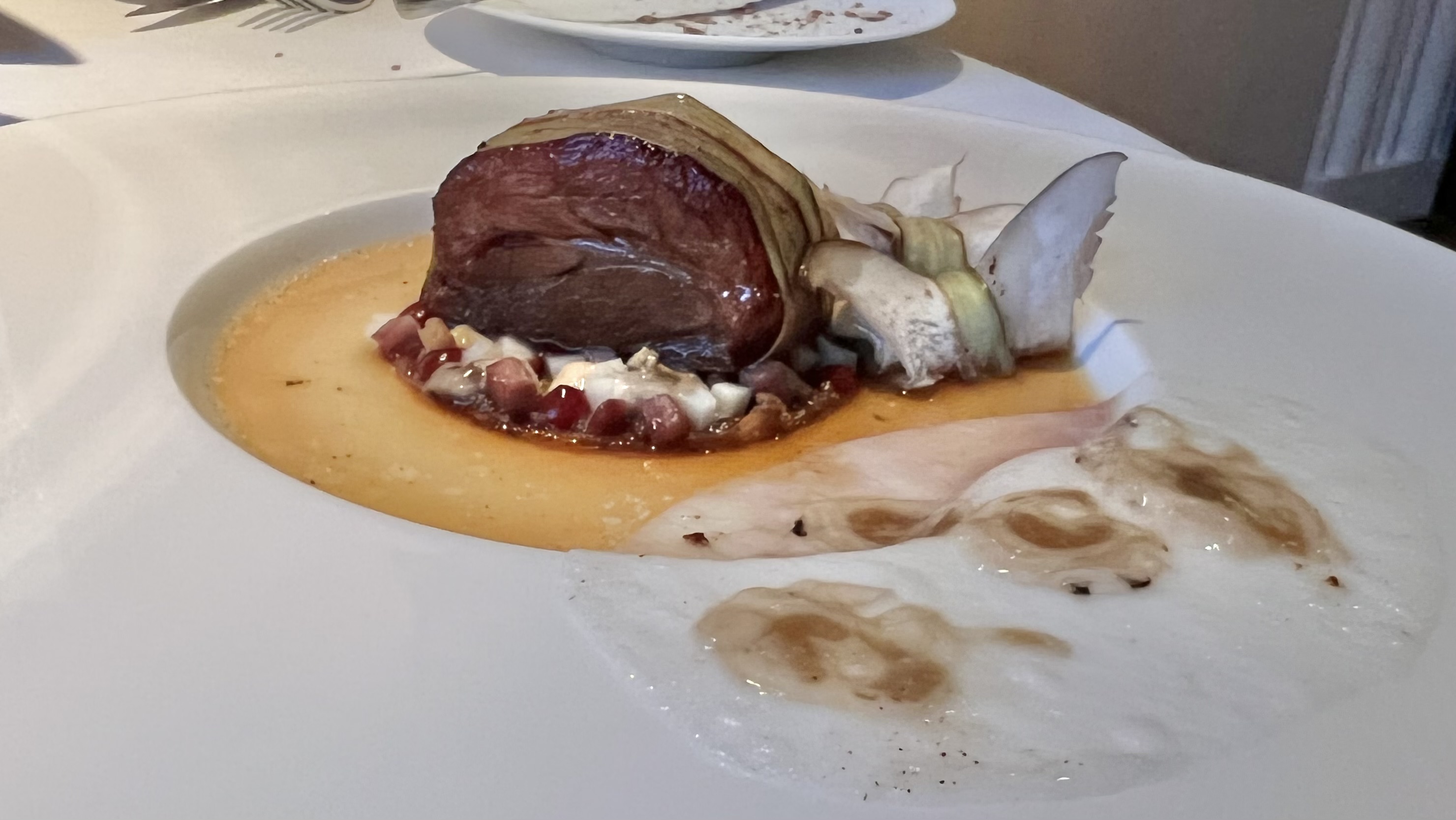 The third course was sole and crab with buckwheat, blackcurrant, and elderflower. At this point we realized there was fruit in almost every dish, but in a elegant way that adds complexity rather than in a ‘pizza with pineapple’ way. It makes the wine pairings more difficult, but this South African wine could easily handle the blackcurrant. The sole and crab were perfectly cooked and the crunchy buckwheat added a nice textural element.