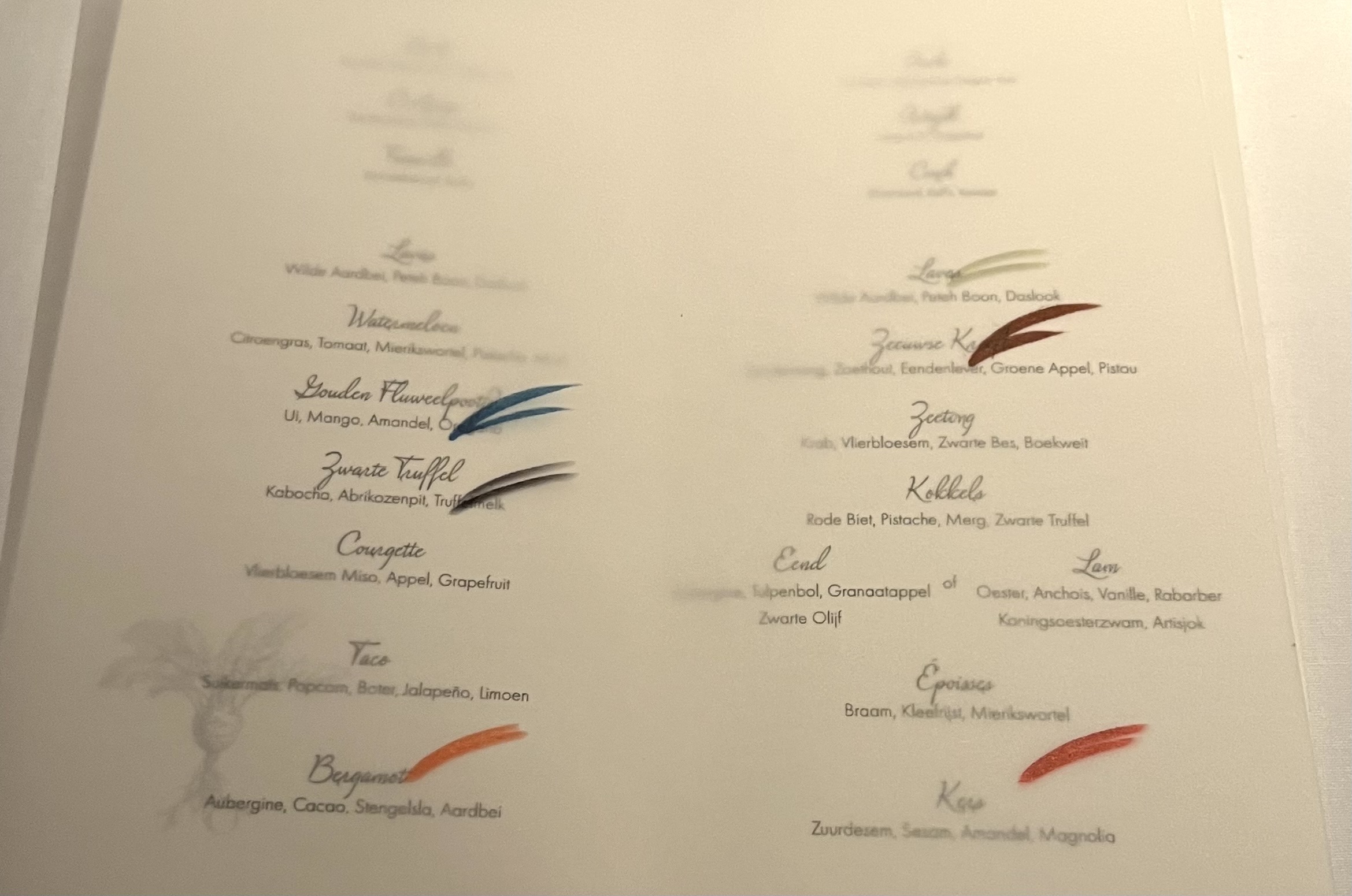 I wanted to introduce our best friends to fine dining in a Michelin starred restaurant, and thought Spectrum would be a great place to do it. The restaurant of chef Sidney Schutte opened in 2014 in the Waldorf Astoria hotel, immediately gained 2 Michelin stars in 2015, and has held them since. I’ve eaten there in 2015 and 2017 (when it was stilled called Librije’s Zusje), and for the last time in 2019 due to the covid lockdowns. At the moment I’m on a ‘cutting’ regimen of nutrition and working to get a bit leaner, so this was a bit of a cheat meal. If you’re doing a cheat meal, you should do it well! The 7-course degustation menu is 210 euros, and we opted for the wine pairing (100 euros).