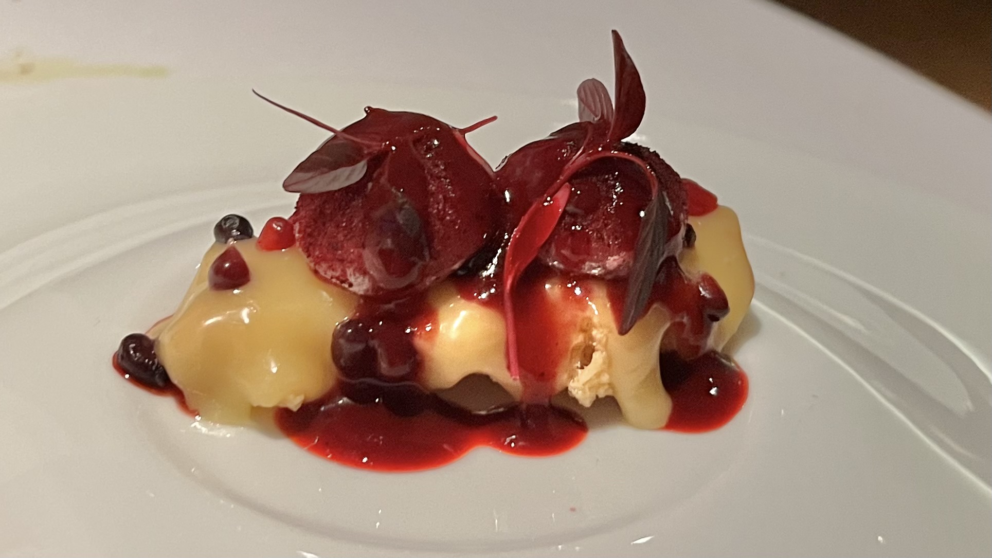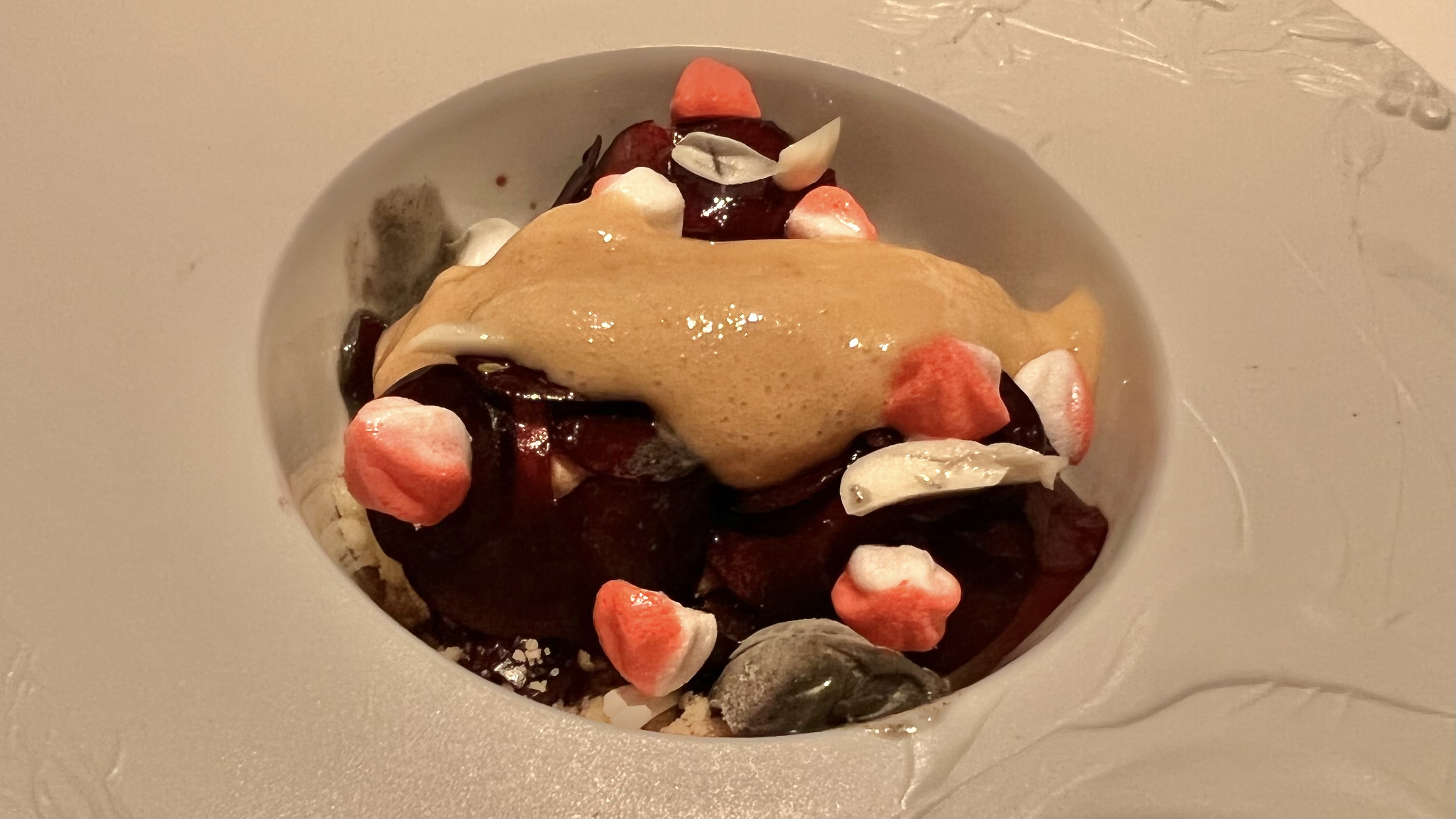 The dessert was cherries with sourdough, sesame seeds, almond, and magnolia. It was very complex and elegant, and the pairing with the Prunello was wonderful.