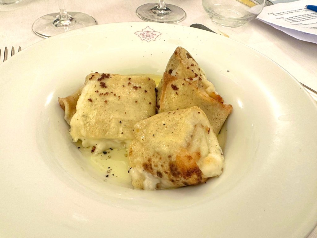 The primo piatto was manfrigole: buckwheat pancakes stuffed with bechamel and casera cheese, served with butter and sage. Very rich and very delicious.