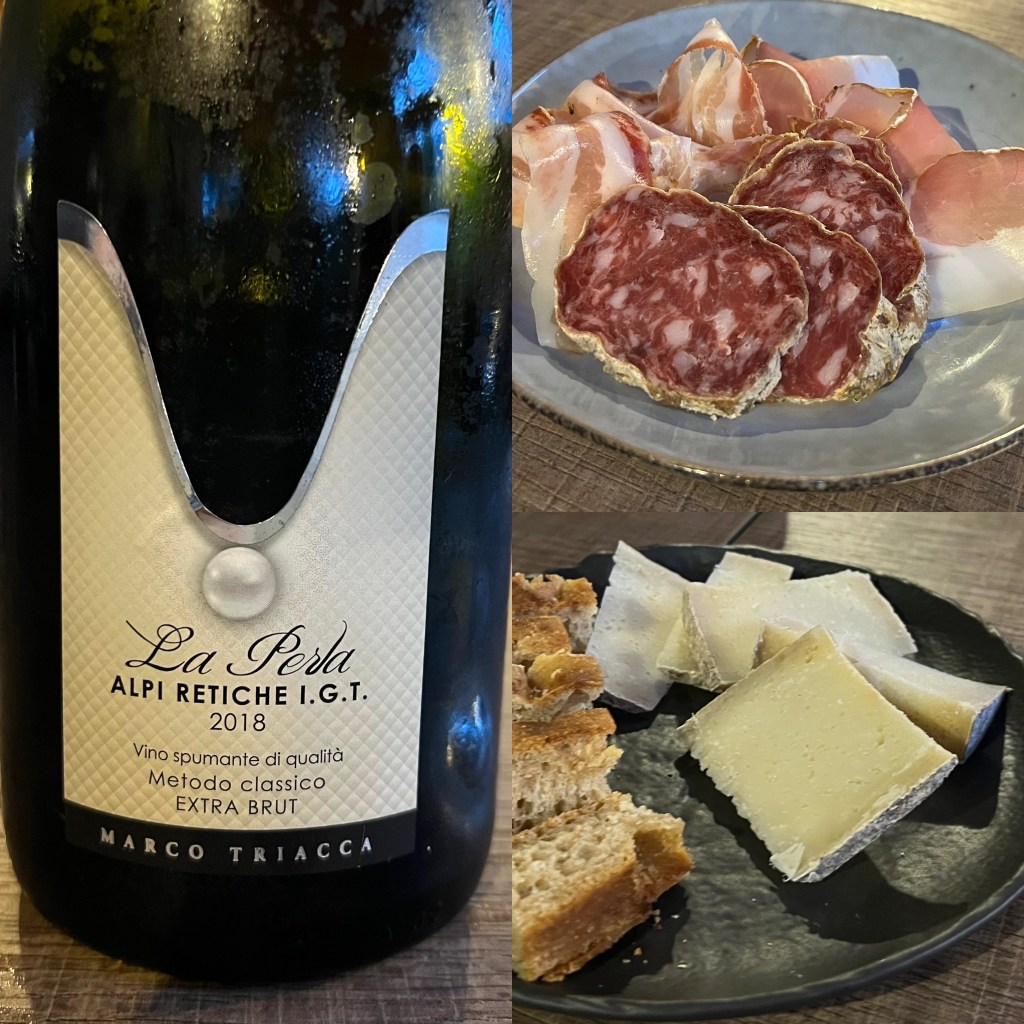 We arrived a bit early at restaurant Trippi for dinner (which incidentally was a restaurant that I had been to myself last year). And so we ordered a nice local sparkling wine, La Perla Metodo Classico Extra Brut 2018, Alpi Retiche IGT, made from the autochthonous red berried grape variety Pignola and aged for two years on the lees after the second fermentation. This was served with complimentary local salumi and cheeses.
