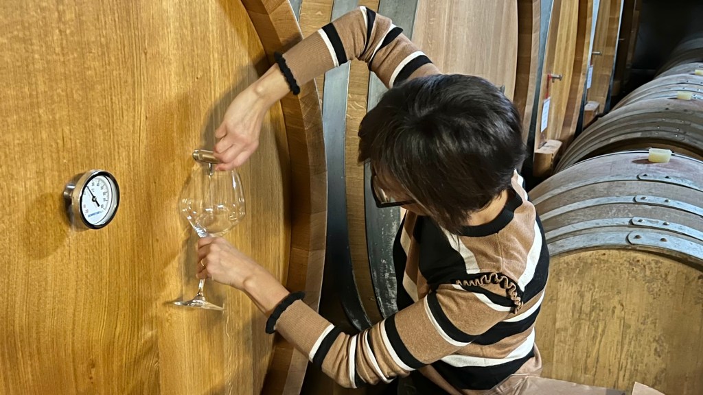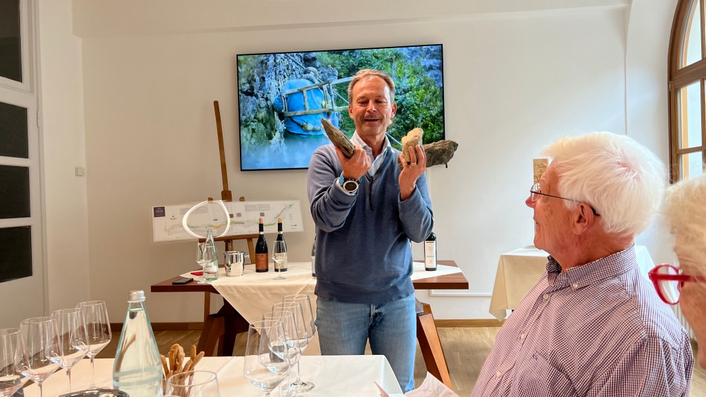 The Sotcastèl Apli Retiche IGT Chardonnay 2020 was already sold out (this is why you see an empty shelf in the tasting room at the highest level), but we were allowed to taste the 2021 vintage directly from the barrel. This wine was very crisp and mineral.