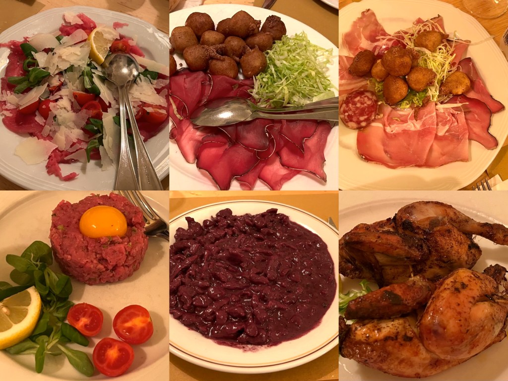 Since we arrived in Valtellina at dinner time, our introduction started with food at Trattoria Olmo in Sondrio. We started by trying all of the antipasti on the menu, which included salumi, beef tartare (mixed with chopped capers), bresaola, and sciatt. Bresaola is cured and dried beef, a typical product of Valtellina with a very deep flavor. Sciatt are fritters made from a batter with buckwheat flour, regular flour, beer, and grappa, filled with local Casera cheese. As a primo piatto I opted for gnocchi al mirtillo, because I was curious how that would be. The gnocchi are made from blueberries and flour, and they are served with a sauce of blueberries with some cream. It doesn’t look very appetizing, but it was delicious. For secondo I chose an oven roasted Galletto Vallespluga, a local small rooster.