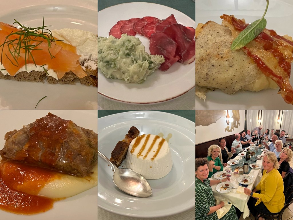 The food was very nice. Antipasti: Capù de Parr (stuffed cabbage), sweet and sour vegetables, polenta with anchovies, salumi and cheese. Primi: fresh pasta with hair and cocoa, risotto with squash, sausage, and Taleggio cream. Secondo: roast veal with potato cream and spinach. Dolce: pear and chocolate cake.