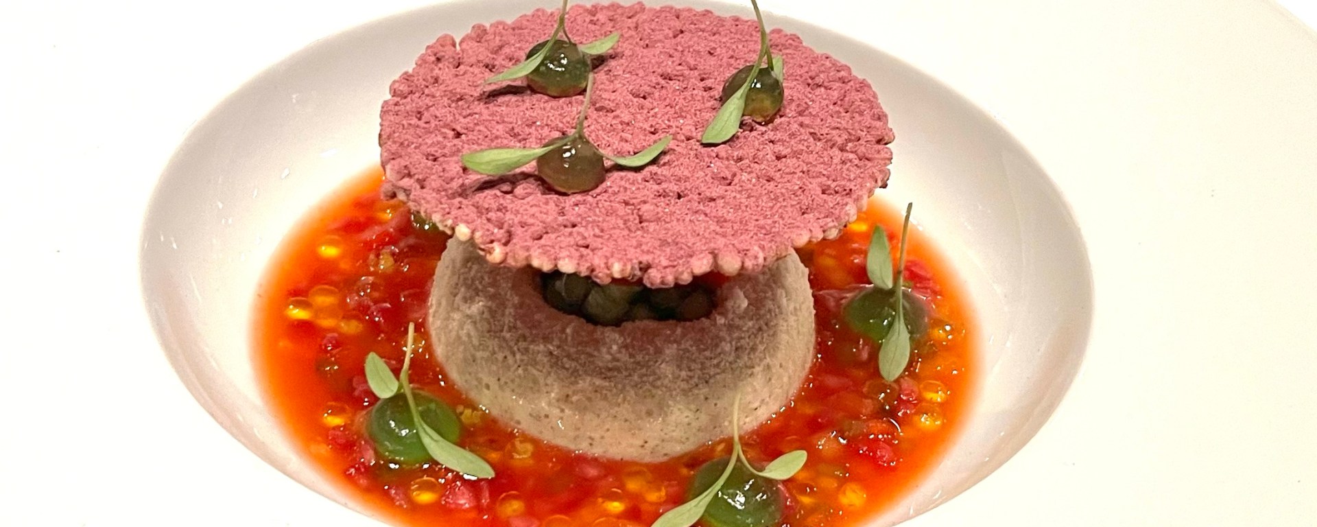 Both wines worked well with their own ‘side’ of the dish, because it came with two different sauces. The dish was a raw carabinero shrimp with carrots, a bisque and a foamy beurre noisette. The bisque worked best with the natural wine and the beurre with the regular one. The carabinero had great flavor and texture and the bisque was perfect: very complex and balanced without any of the unpleasant edges that bisque can have.