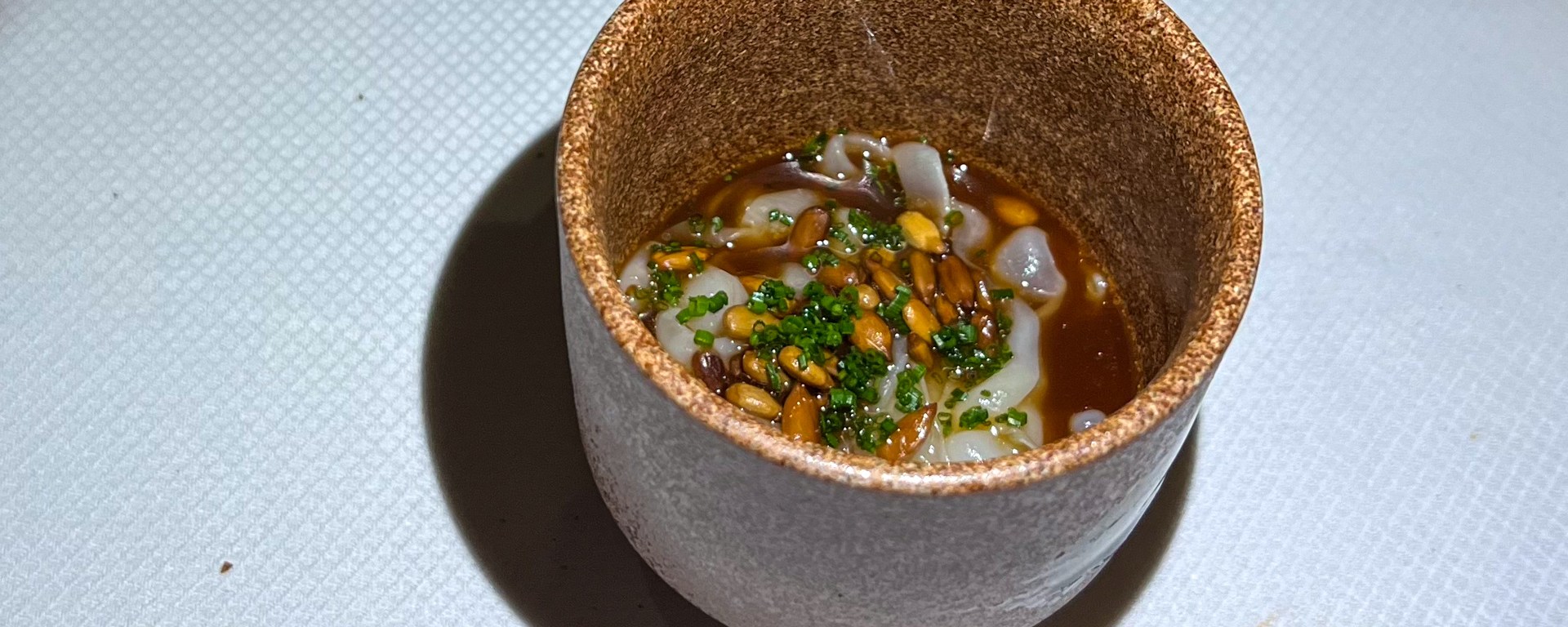 It was an very good pairing for the raw seabream with oyster, elderflower, white radish, and myoga. The nice thing about this dish was that it combined texture of the raw sea bream with the flavor of oyster. The wine brought out the oyster. The dish was not underseasoned, but I think this dish and the wine pairing would be even better with a smidge more salt, as the wine had a lot of body for such an elegant dish.