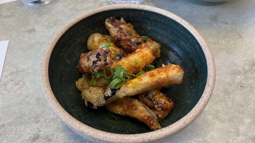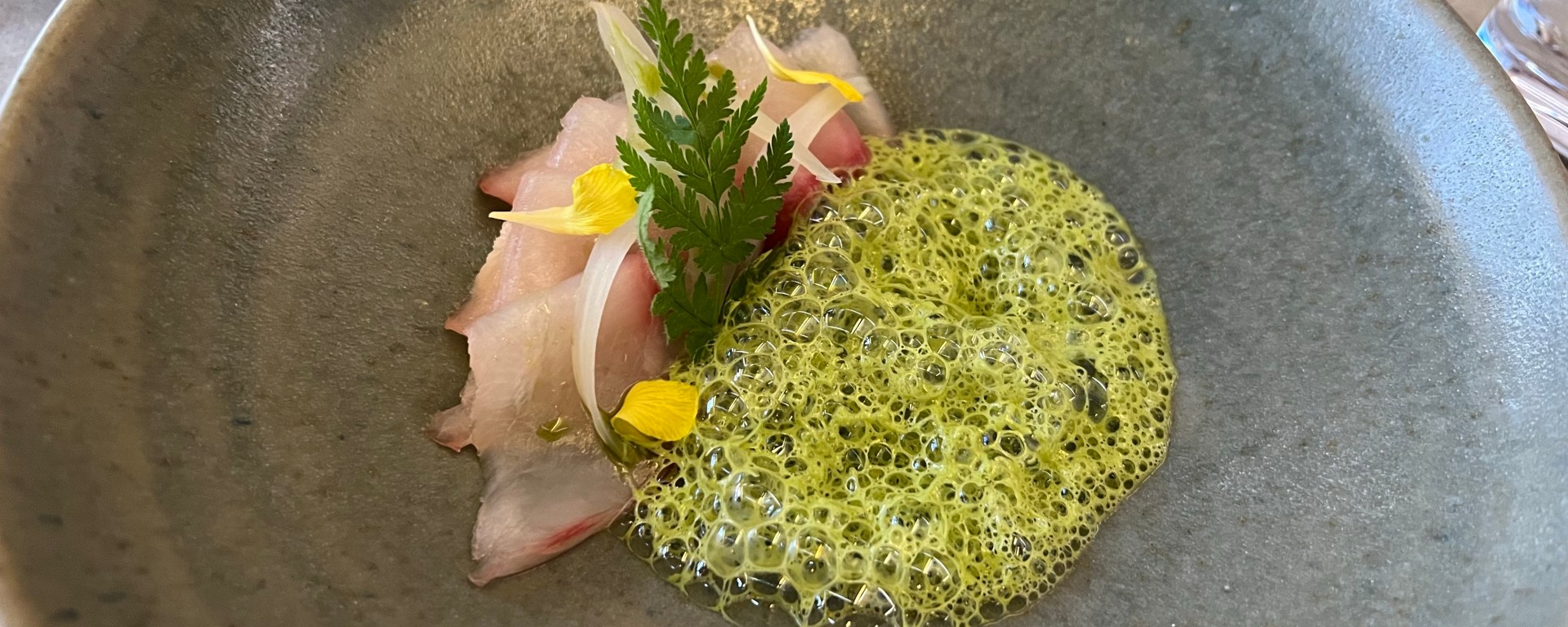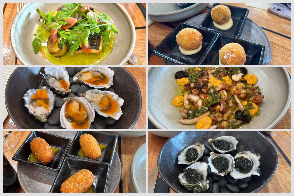 …and a scallop with nasturtium leaf nam jim jaew. This was paired with a Willie Smiths ‘Pet Nat’ Cider 2023 from the Huon Valley, Tasmania. In both sets the flavor intensity was quite different between the three appetizers, which made the pairing with the wine work better with some appetizers than with others.