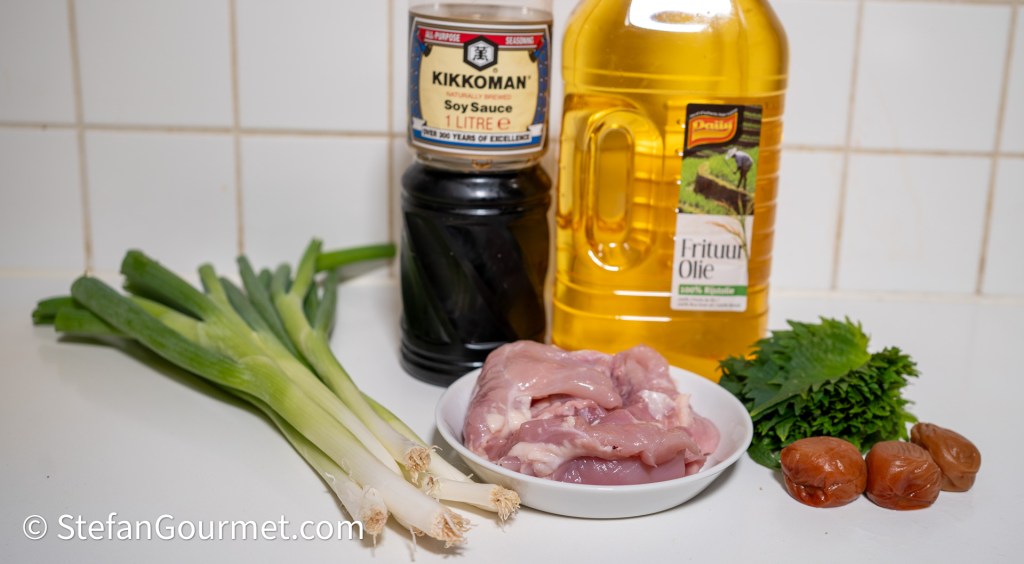 Shiso leaves are most often seen as a garnish for sashimi. They have a vibrant, herbaceous, and citrusy flavor. Unfortunately they are EUR 0.35 per leaf here, so I only prepared a small portion. Umeboshi are Japanese salted plums. The combination of juicy and tender chicken thigh meat with shiso and umeboshi is absolutely delicious and this is easy to prepare.
