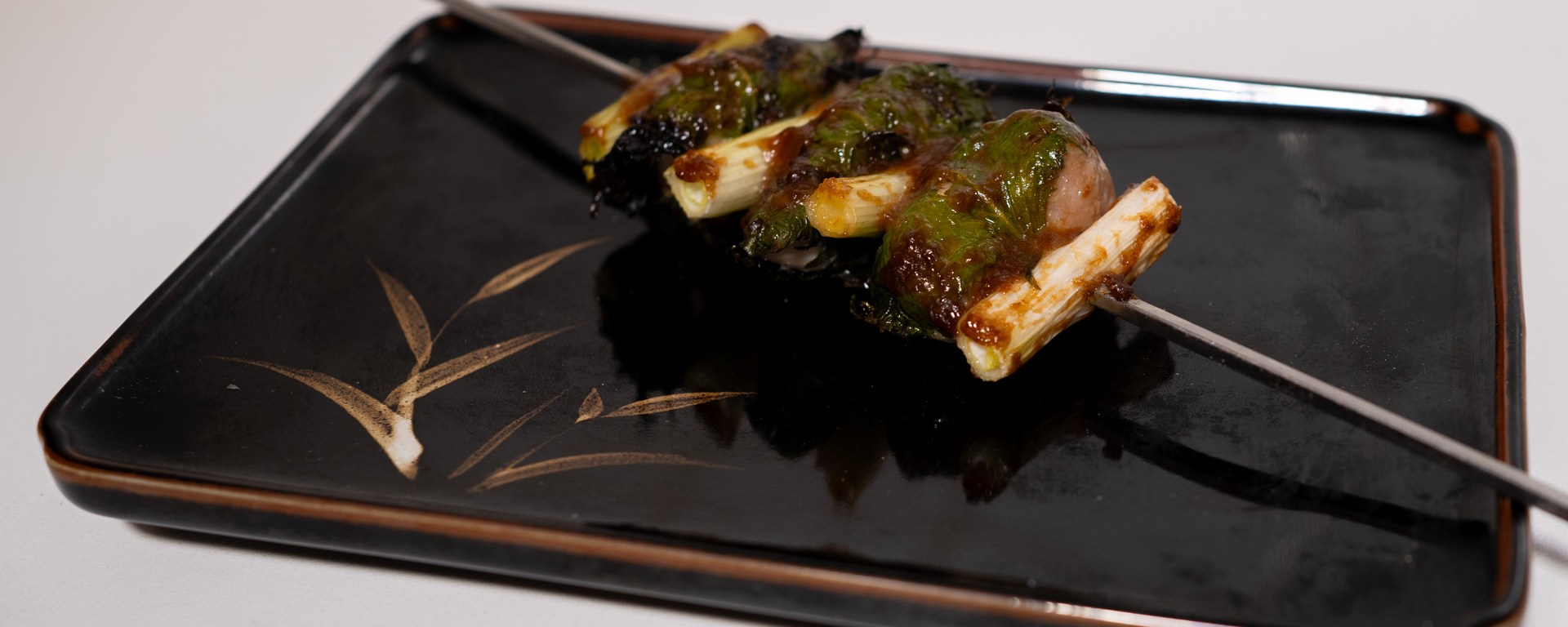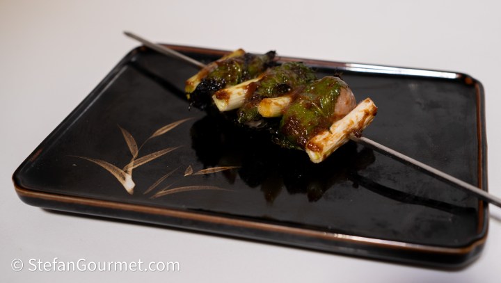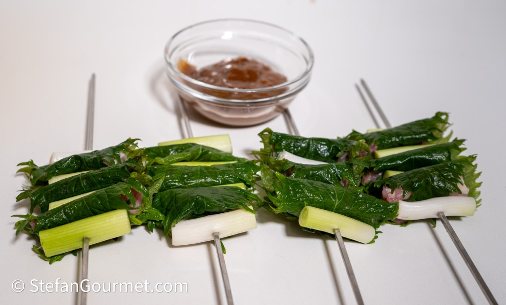 Wrap each piece of chicken in a shiso leaf. Put the scallions and the shiso-wrapped chicken on skewers, alternating between scallion and chicken, and starting and ending with scallion. Each skewer has 4 pieces of scallion and 3 chicken pieces.