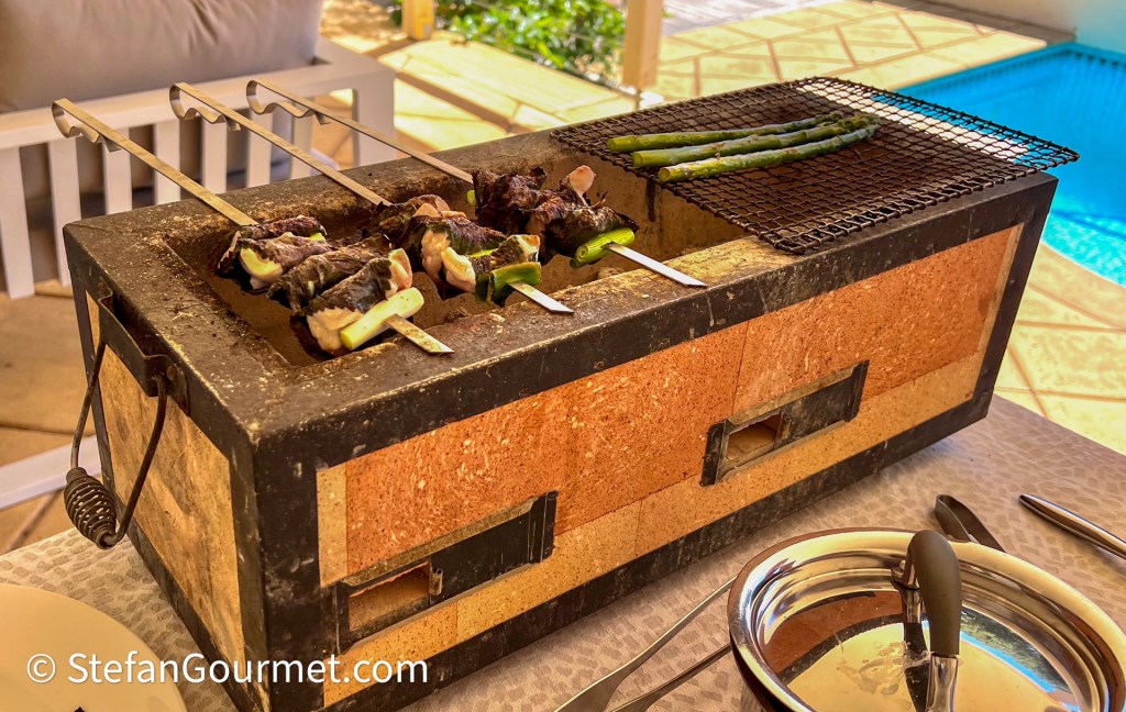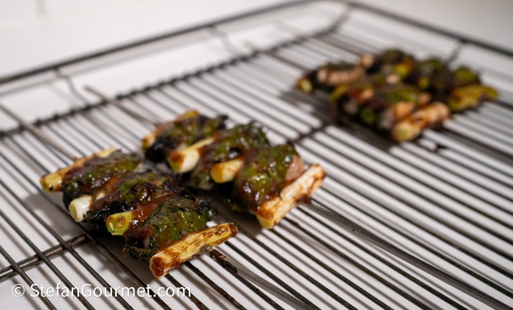 Grill for a couple of minutes close the the broiler element, turn, and brush the other side with the umeboshi. Repeat until you have brushed and broiled each side twice. The skewers should end up slightly charred and the chicken done but juicy.