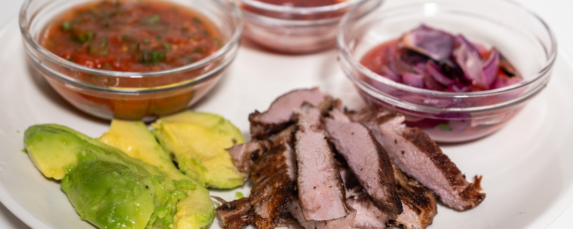 Serve the pork with the tomato salsa, marinated onions, habanero salsa, and corn tortillas. Optional: refried beans and avocado.