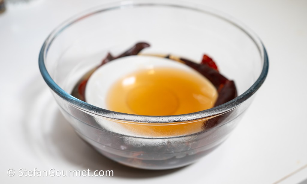 Place the chiles in a large bowl, cover with hot water, put a plate on top to keep the chiles submerged, and allow the chiles to soak for 30 minutes.