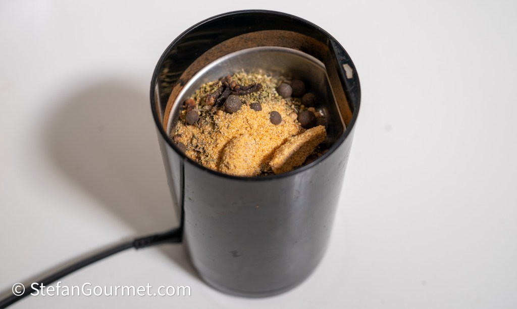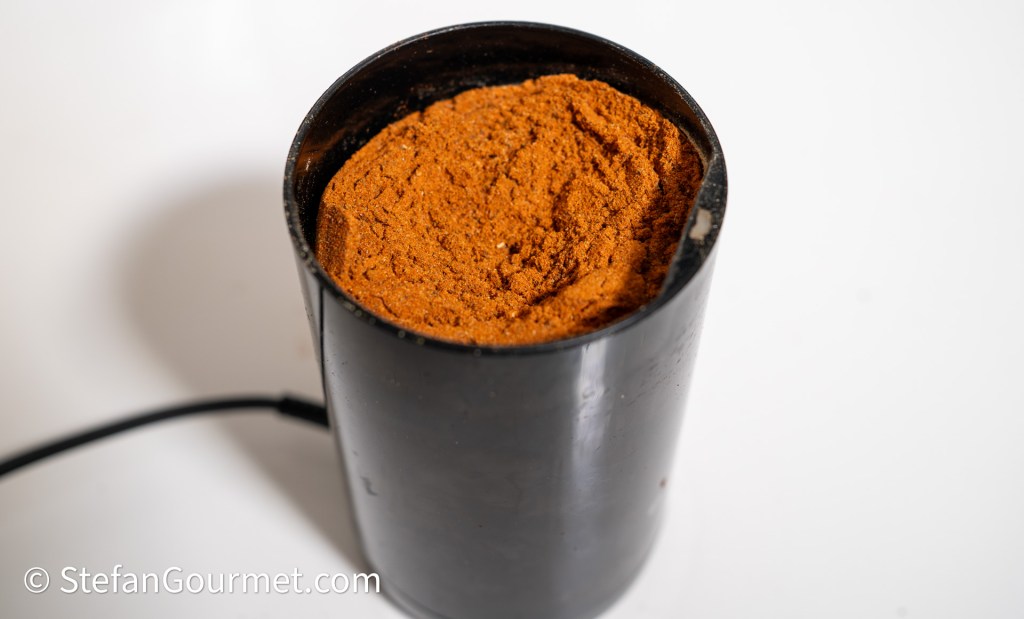 Use a spice grinder to grind 3 Tbsp sweet paprika powder, 1 tsp black peppercorns, 1/2 Tbsp cumin seeds, 1 Tbsp Mexican oregano, 1/2 tsp coriander seeds, 1/2 tsp dried thyme, 1/2 Tbsp garlic powder, and 1/2 tsp whole allspice…