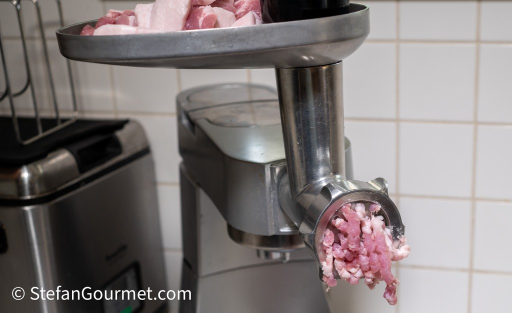Grind the pork belly coarsely with a meat grinder.