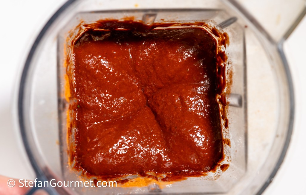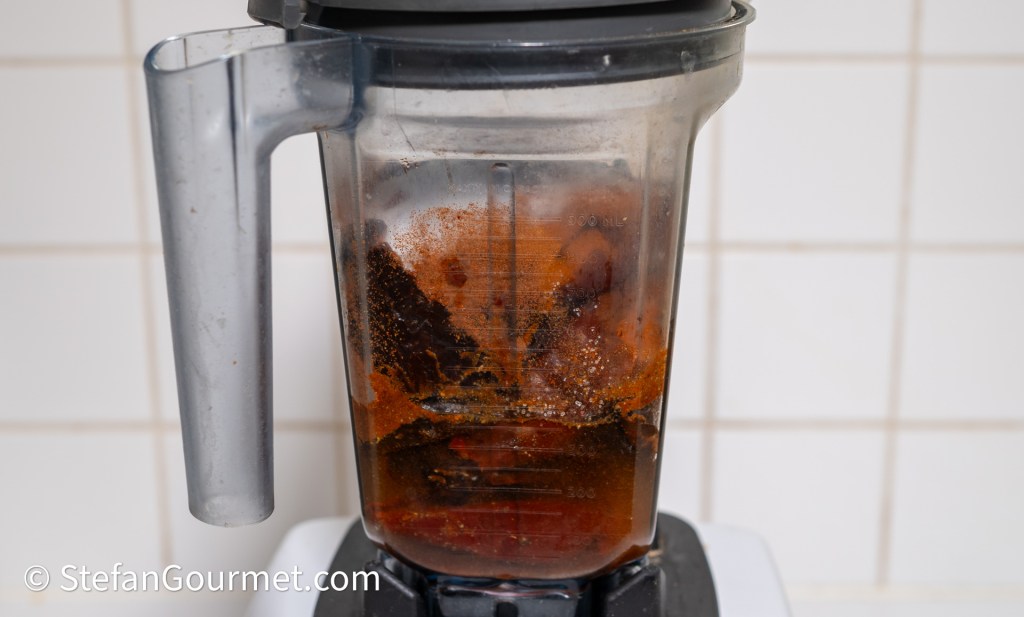 Place the chiles in a blender with the ground spices, 45 grams of salt, bay leaves, and 250 ml of white vinegar.