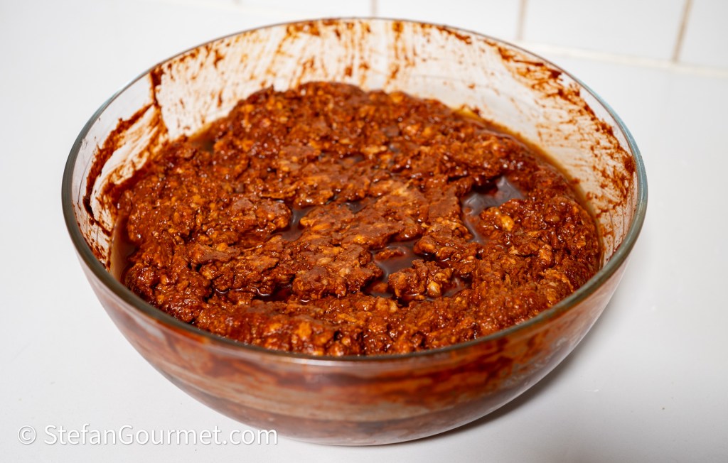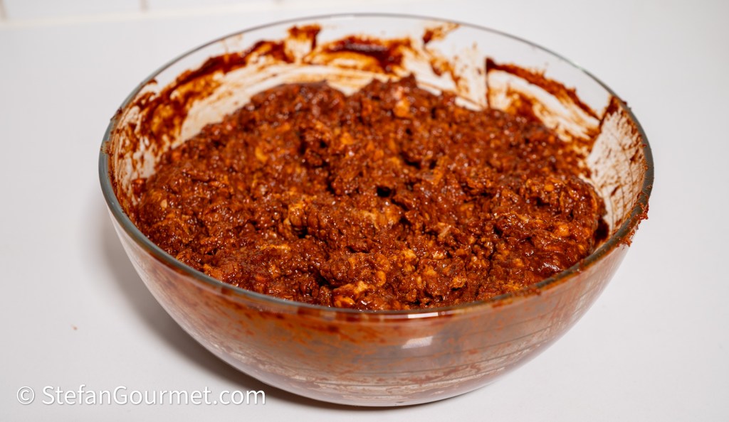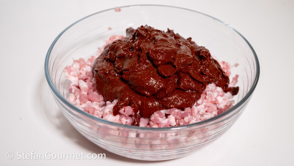 Place the ground pork in a bowl together with the pureed chile mixture…