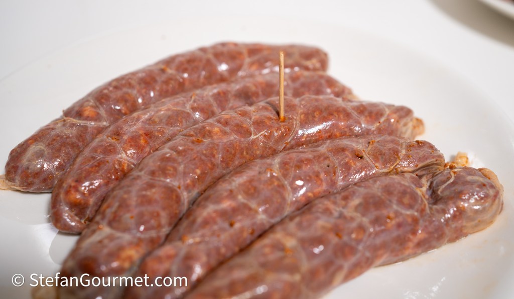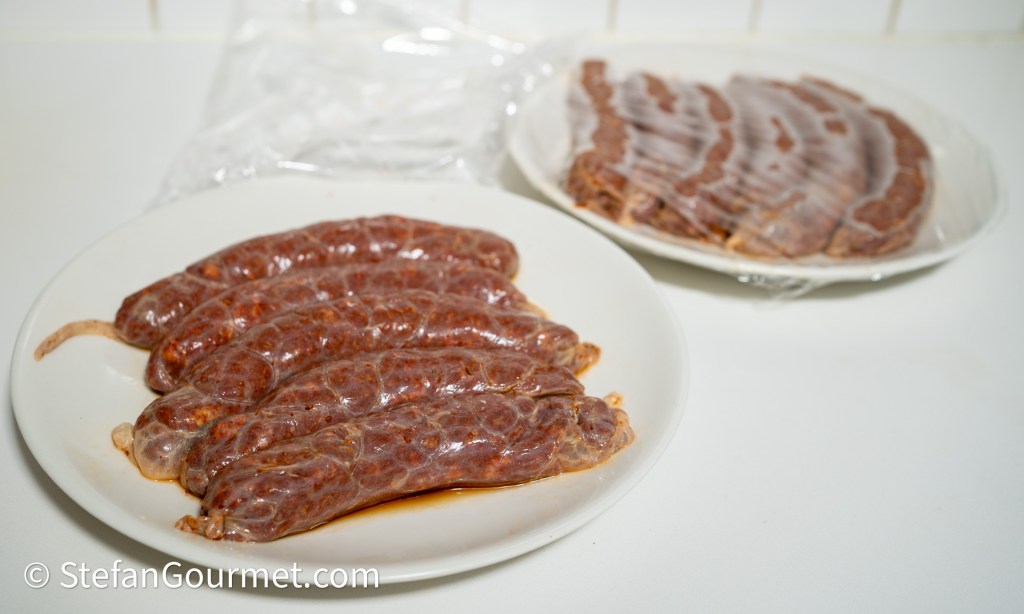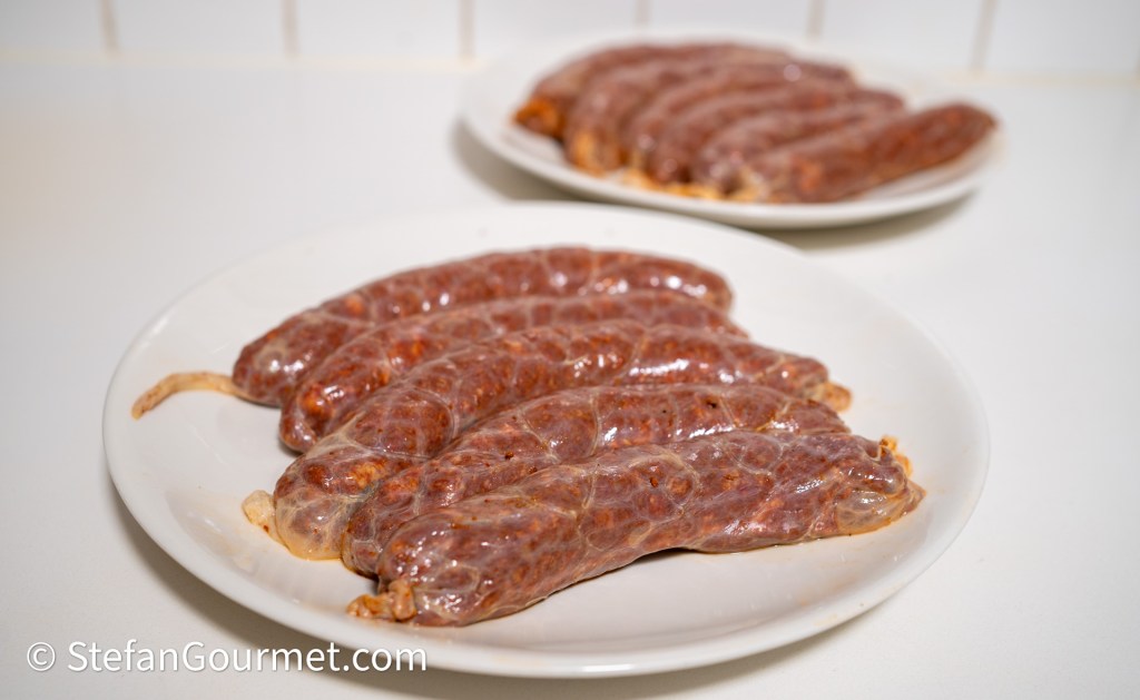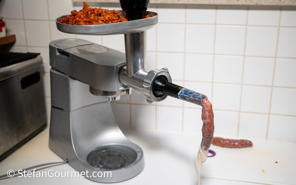 Use the sausage stuffing attachment of your meat grinder to stuff the sausage meat into casings. This was the first and only time I’ve done this, so you are better off with googling how to do this than by me describing what I did. I’d say it is not difficult as long as you are not concerned that all sausages should have exactly the same size and should be completely without trapped air.