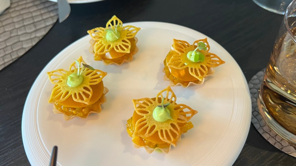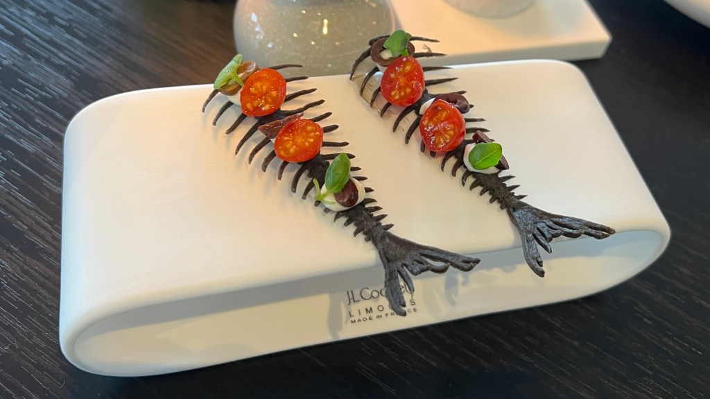 The first appetizer looked like a fishbone and included tomato, olive, and anchovies, and was delicious with the different flavors popping up in succession.