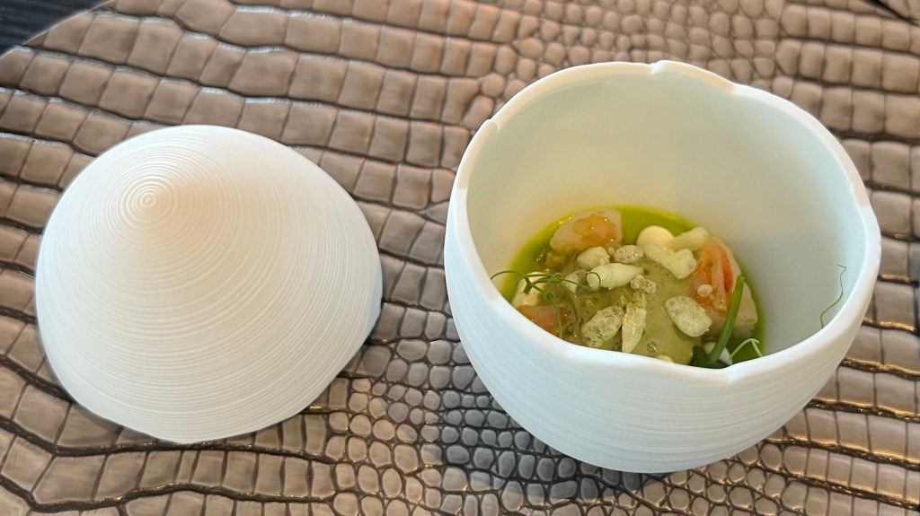 The third with peas, shrimp, and lovage was excellent, with great texture of the shrimp.