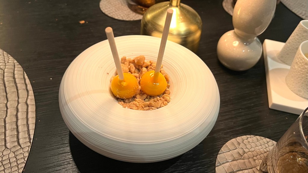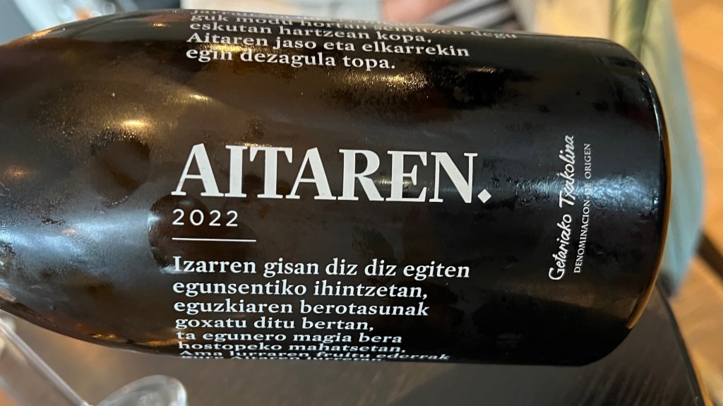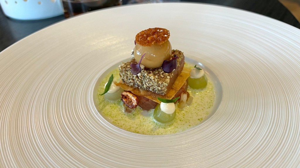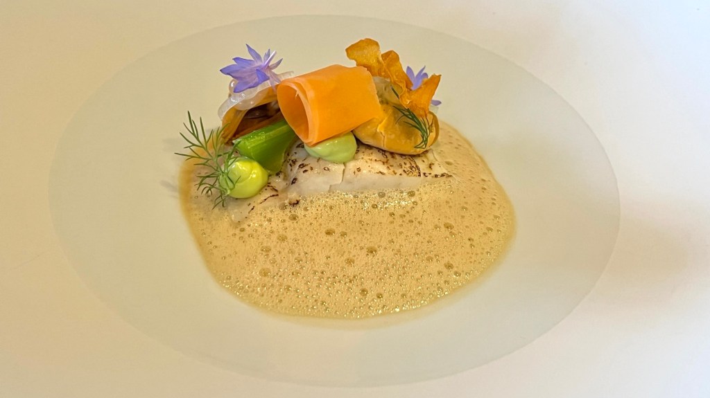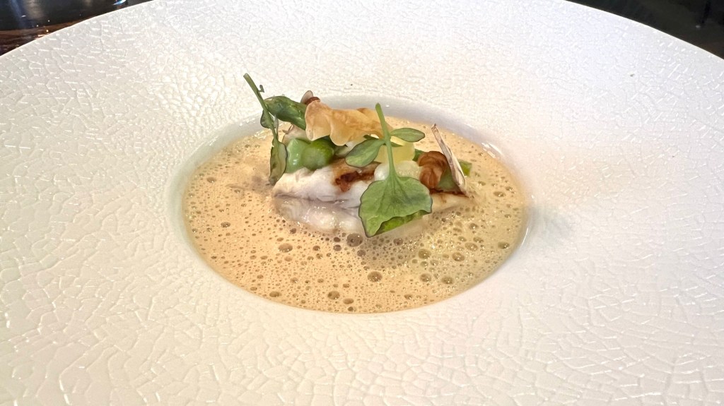The sommelier had suggested to drink the Xarel-lo with the first two courses, but as it was such a good pairing we did not have enough left for the second course. And so I asked to pour a glass of the ‘standard’ pairing with this dish, a Tzakolina from the Basque region in Spain. Saline with a creamy texture like the Xarel-lo, but less complexity. We tried both wines with the second course. (It was a nice gesture that the Tzakolina did not appear on the check.)