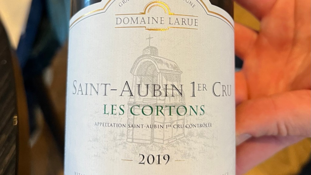 The next wine was a 2019 Saint-Aubine 1er Cru Les Cortons by Domaine Larue (100% Chardonnay, aged in oak with stirring of the lees). A wonderful white Burgundy, buttery, mineral, balanced.
