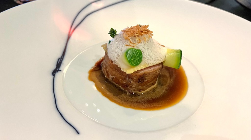 Before the final appetizer we switched to the first wine, an oaked Xarel-lo from Penedès in Spain. Nice oak, great saline minerality, and a nice creamy texture. Not as acidic as Xarel-lo often is.