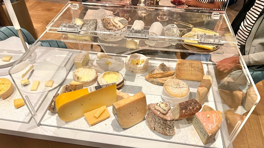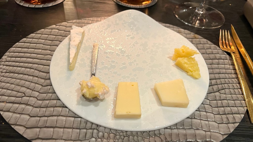 We asked for a selection of medium-flavored hard cheeses and white mold cheeses, as those would work well with the wine. (The restaurant staff was more inclined to serve a wide selection of cheeses that would not all go with the same wine.)