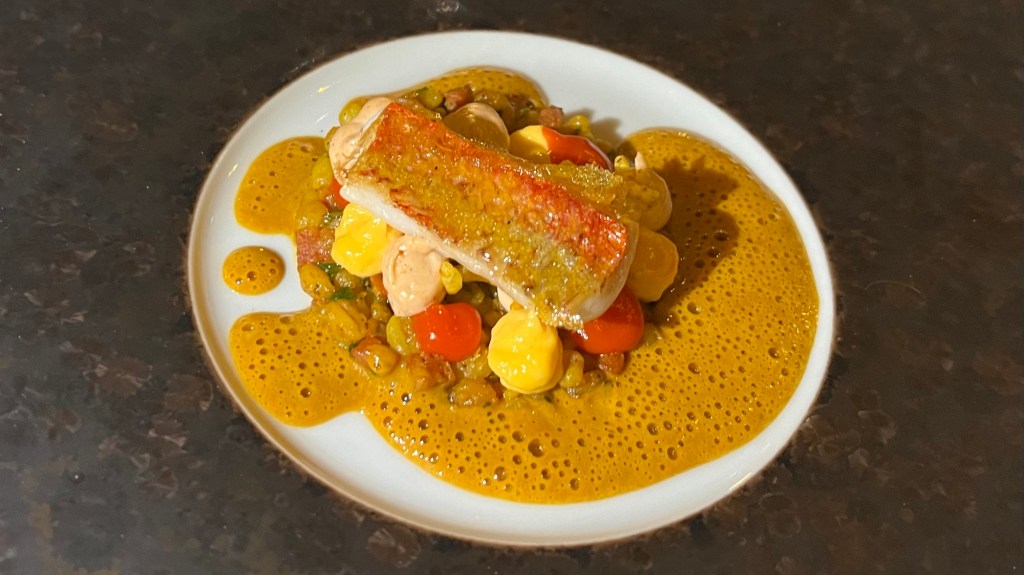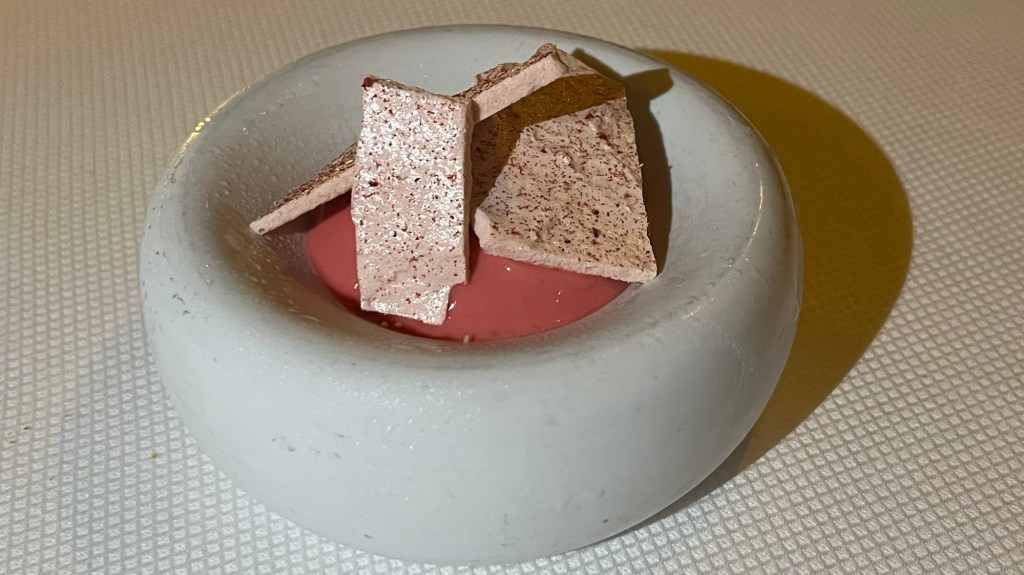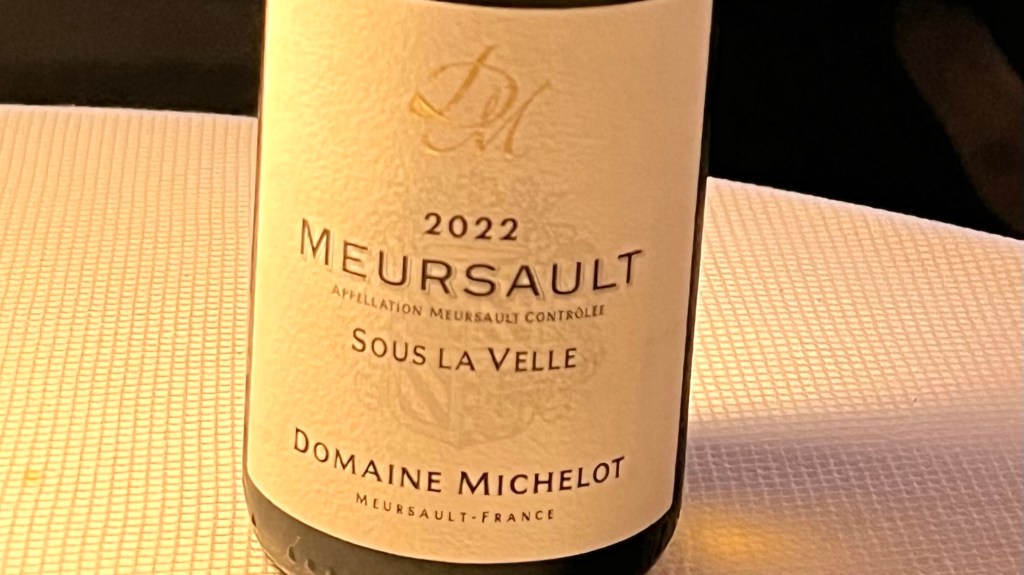 As a wine lover I have a rule of thumb that I’d like to spend about the same on the wine as on the food. The wines of the pairing were not bad at all and paired well with the dishes, but of a lower level than what I am used to drinking at home. And so I enquired whether any upgrades would be possible. The wines in the pairing are the only ones available by the glass, but there is a nice selection of half bottles. The sommelier allows you to taste each wine before pouring a whole glass, and we did not like the next wine. I looked at the list of half bottles, saw a Meursault, and asked the sommelier whether it would pair with the dish. He said it would, and so that was an easy choice for me as a lover of Côte d’Or whites. This 2022 Sous la Velle Meursault by Domaine Michelot was very elegant (i.e. not as rich as Meursault can be) with great minerality and a nice balance, wonderful. This was the first time ever I’ve had a Meursault with a screwcap.