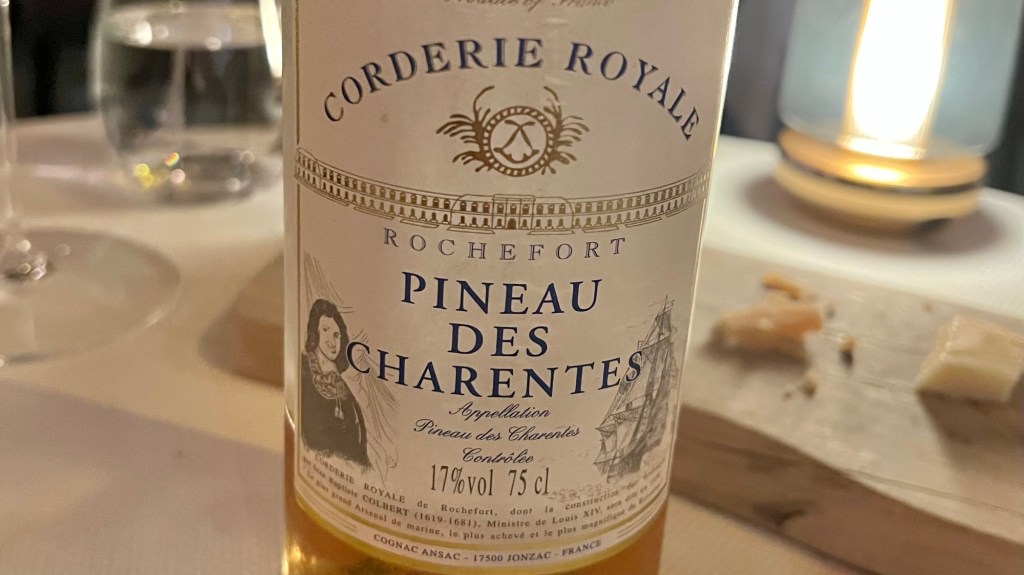 The sommelier gave us a sip Pineau des Charentes, a mix of grape must with cognac, that was an excellent pairing with the aged cow milk cheese.
