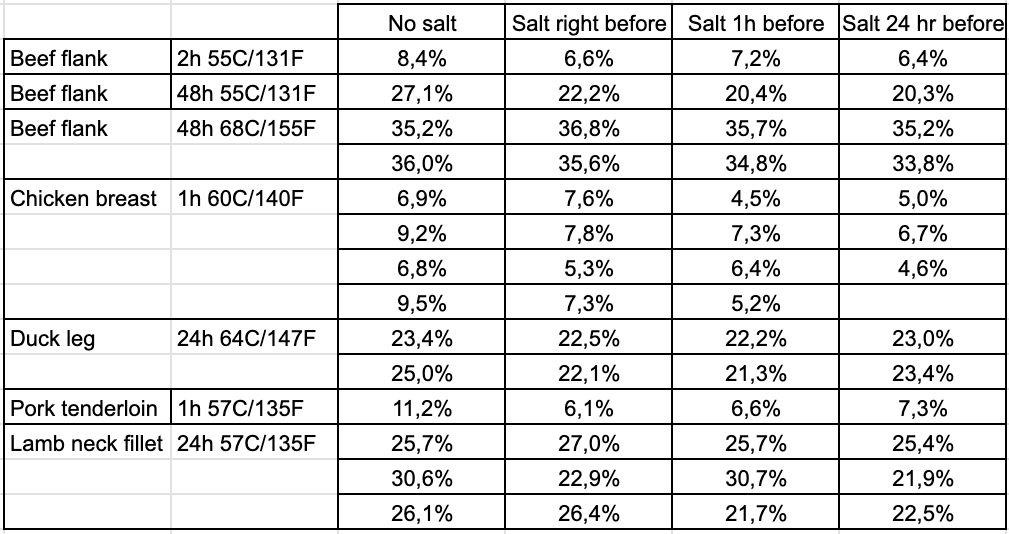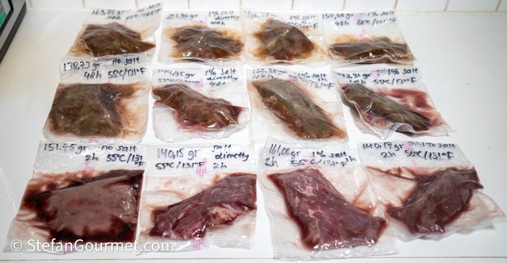 So then I did a lot of experiments where I cooked meat sous vide right away after salting and vacuum sealing it and compared that to allowing the salt 1 hour or 24 hours to penetrate into the meat before cooking. I did this with meats requiring a short cooking time such as chicken breast, but also with cooking times of 24 or even 48 hours. Most of the experiments were with lower cooking temperatures.