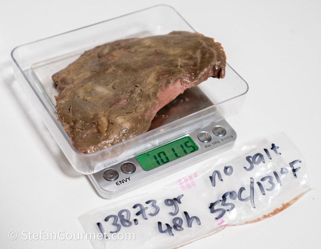 The difference in weight as a percentage of the original weight, tells us the amount of juice from the meat that was lost during the cooking process. In the photo this is (138.73-101.15)/138.73 = 27%. When that number is lower, more juices have remained inside the meat, so the meat is more juicy. I weigh the meat before and after instead of measuring the amount of juices in the bag, because that is more accurate.
