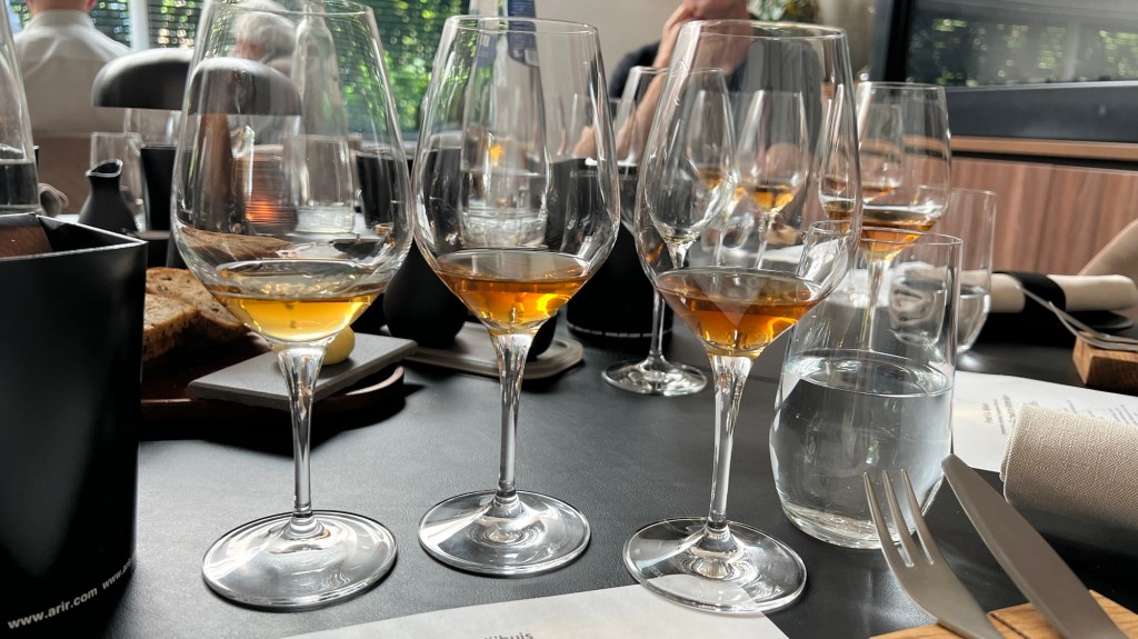 Ruffino is a producer from Chianti in Tuscany that here has used grapes from Puglia to make the sweet fortified wines. They were aged in wooden casks and bottled later. A bit like PX, but less sweet, and more acidic. The Jura improved a bit with white-mold or Comté cheese. Vernaccio di Oristano is similar to sherry and from Sardinia. Since it is NV the age is unknown, but this one seemed to have aged a bit too much. The same goes for the Madeira.