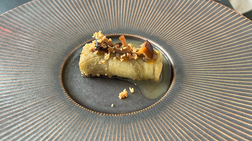 Next was eggplant with shiitake mushrooms and a sweet and sour ponzu sauce. This would also pair well with some of the Rieslings.