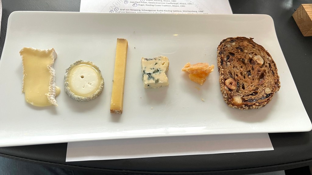 We ended with cheese instead of dessert, to pair better with the final flight of wines. A white mold similar to raw milk Brie, a soft goat cheese, 4-year old Comté, blue cheese, and 8-year old Gouda.