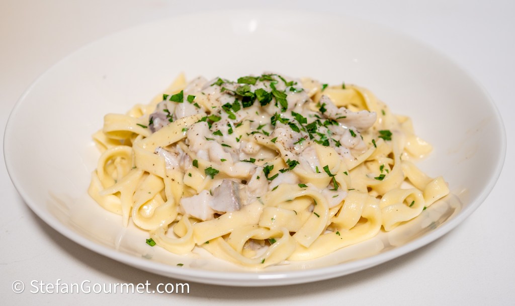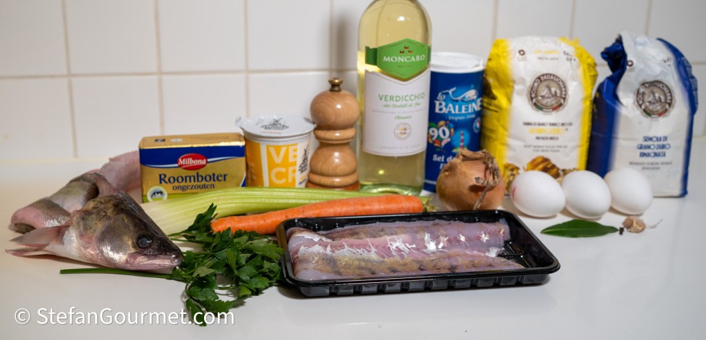 This pasta dish was inspired by a fish stew from Burgundy called Pôchouse. The fish is poached in white wine and the poaching liquid is reduced together with fish stock and then turned into a creamy sauce by adding crème fraîche and thickened with beurre manié. I thought this would be great over fresh pasta, and it turns out I was right. For this recipe I slightly simplified the method and omitted the eel (which you could certainly also add). Because of the use of crème fraîche and beurre manié this is a bit of fusion between French and Italian cuisine — Italians would be more likely to use regular whipping cream and make the sauce like a besciamella (white sauce). But the most important thing is that this is truly delicious and that I will definitely make it again. In fact, I made it recently without taking photos, and made it again soon to blog it. Pikeperch is also known as zander and is a freshwater fish. You could also make this with a white saltwater fish that doesn’t flake too much like sole, European seabass (branzino) or halibut.