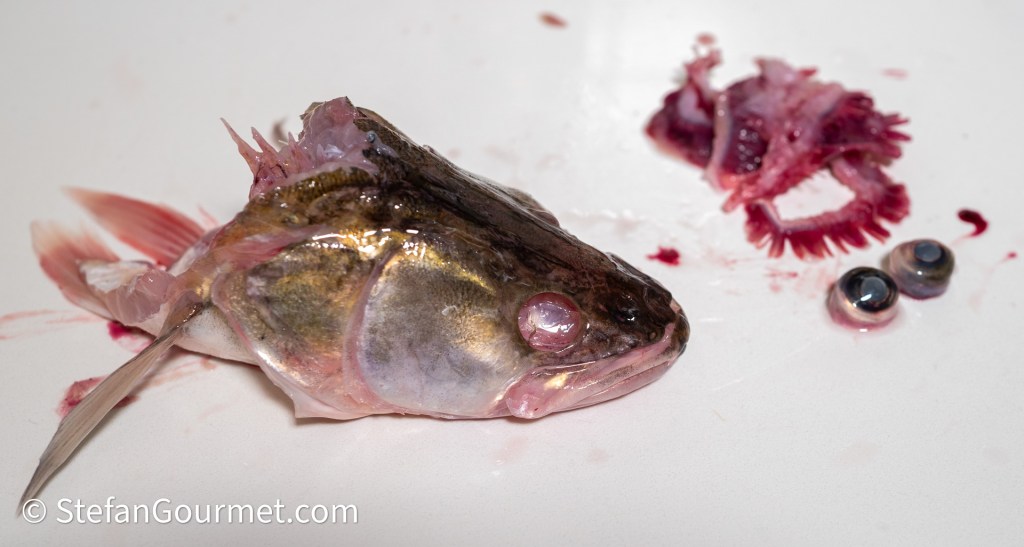 Start by making the fish stock from the head, bones, and skin of the fish. Remove the eyes and gills from the head, as they would make the stock bitter. Make sure all of the innards of the fish have been removed.