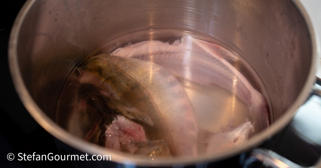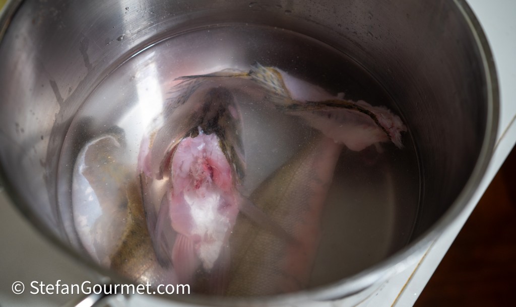 Soak the fish head, bones, and skin in cold water for a few minutes to remove most of the blood.