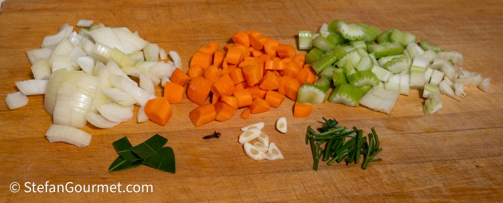 While you are waiting for the water to come to a boil, prepare the aromatics for the stock: chop the onion, carrot, celery, garlic, parsley stalks, and bay leaf. After skimming the stock, add all of them together with the clove.