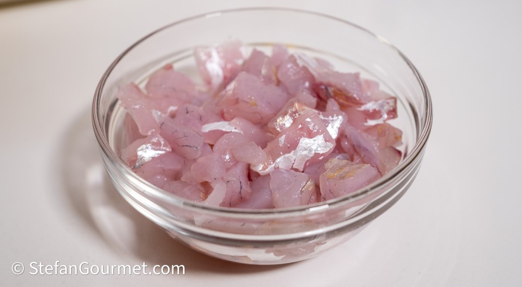 Then dice the fish, and place it in the refrigerator to allow the salt to penetrate into the fish.