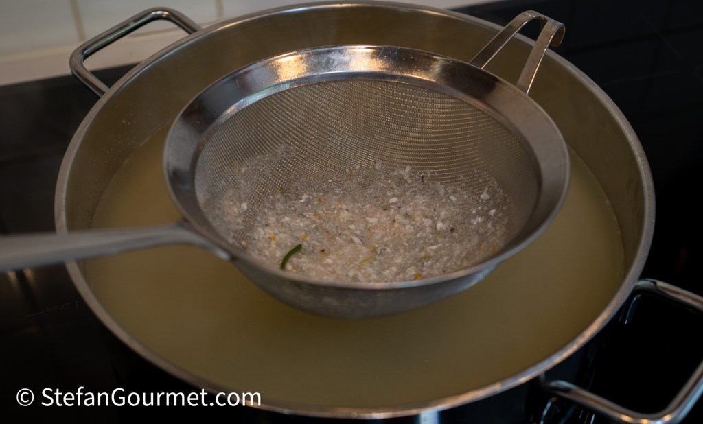 Sieve the stock. First with a colander to get rid of the large pieces…