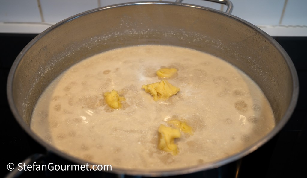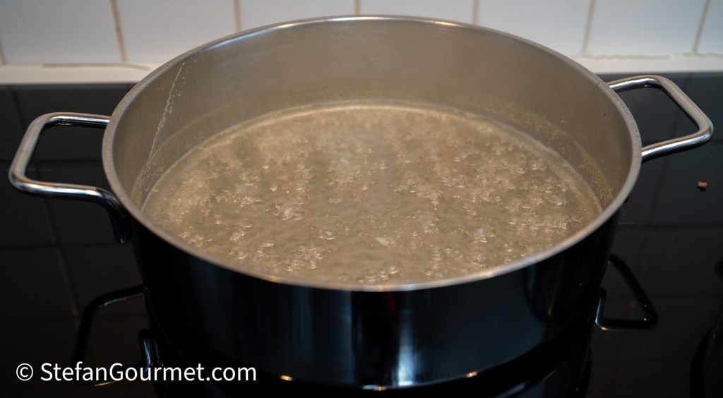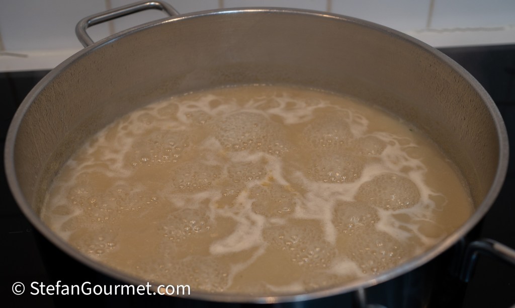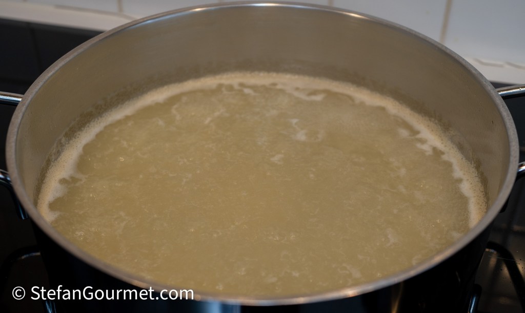 While you are waiting for the water to boil, bring the fish stock and white wine mixture to a boil.