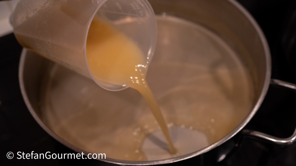Pour the stock into a wide shallow pan, bring to a boil, and simmer gently to reduce to about 250 ml (1 cup).