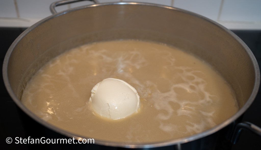 Add 60 grams of crème fraîche, and stir over low heat until it has been dissolved.