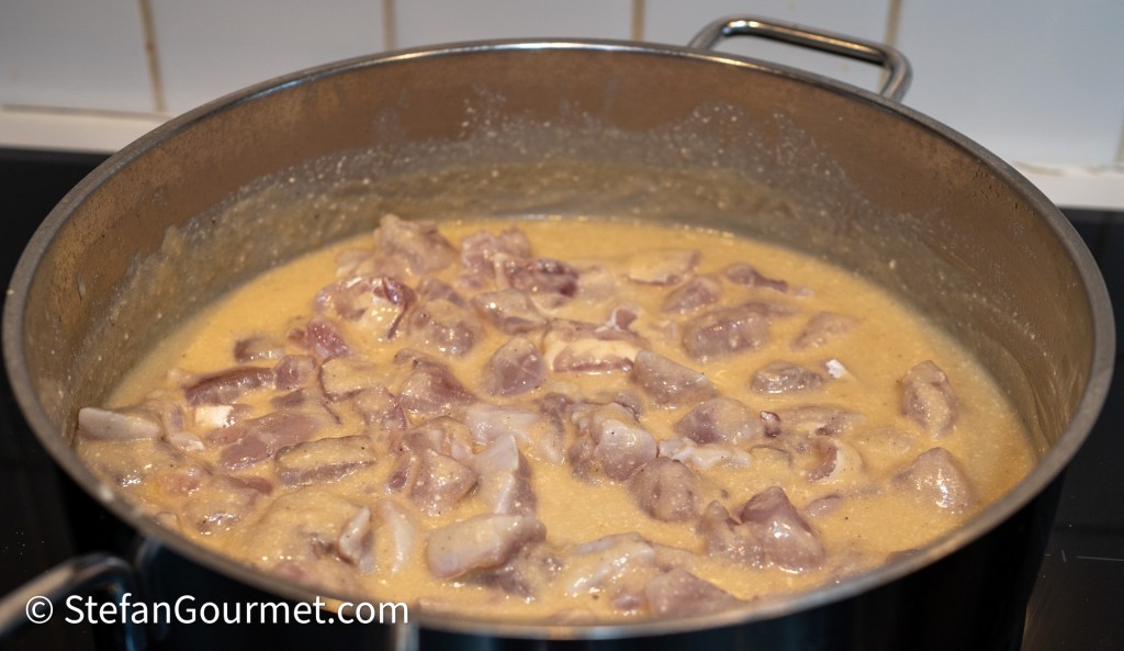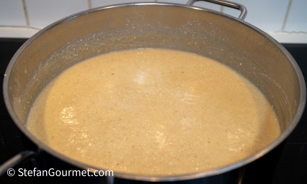 Stir over low heat (a slow simmer) until the beurre manié has been dissolved and the sauce has thickened. Taste and adjust the seasoning with salt and freshly ground black pepper.
