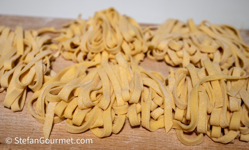 Up to here the recipe can be prepared in advance. Make sure to sprinkle the pasta well with flour or to leave the sheets to dry a bit before cutting them, as otherwise the tagliatelle may clump together.