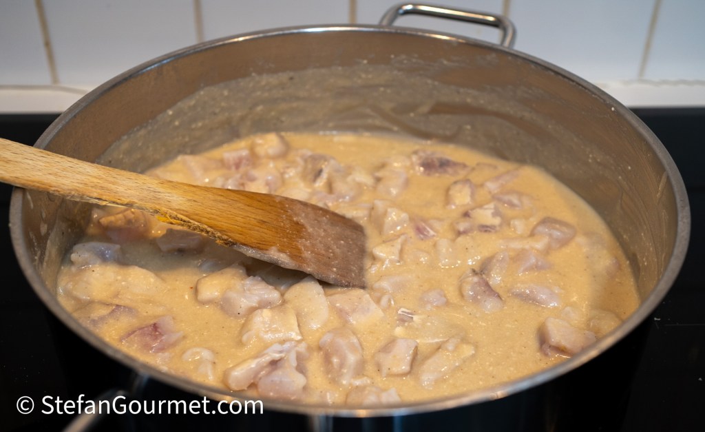 Cover and allow the fish to cook in the sauce over very low heat. The sauce should not boil.