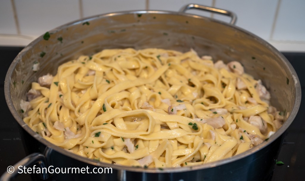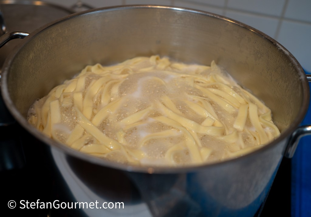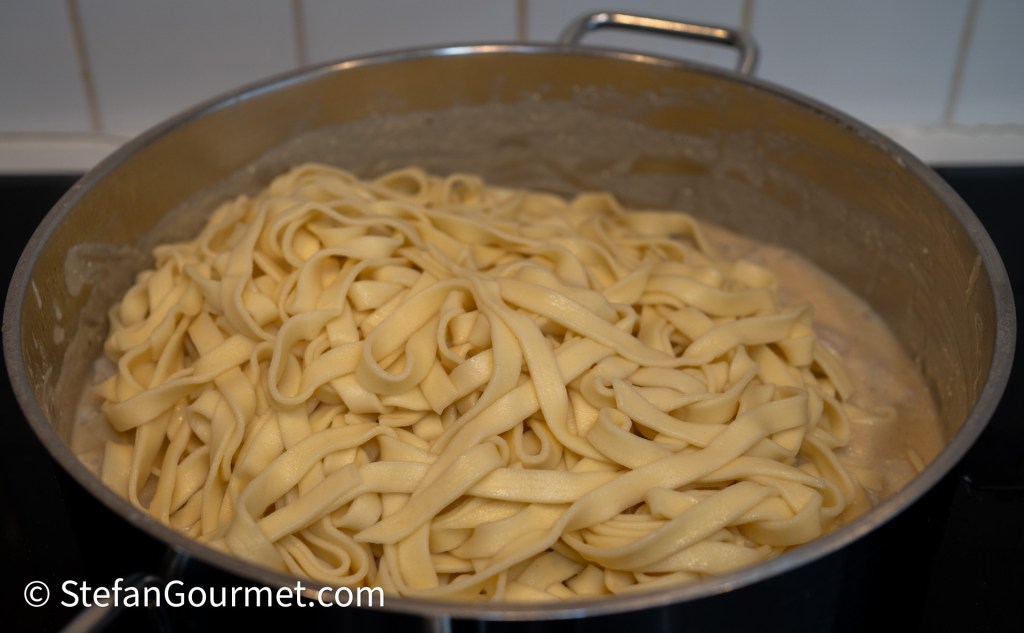 Make fresh tagliatelle using my instructions. They should be about 7 mm wide (about 1/3 inch) and not too thin.