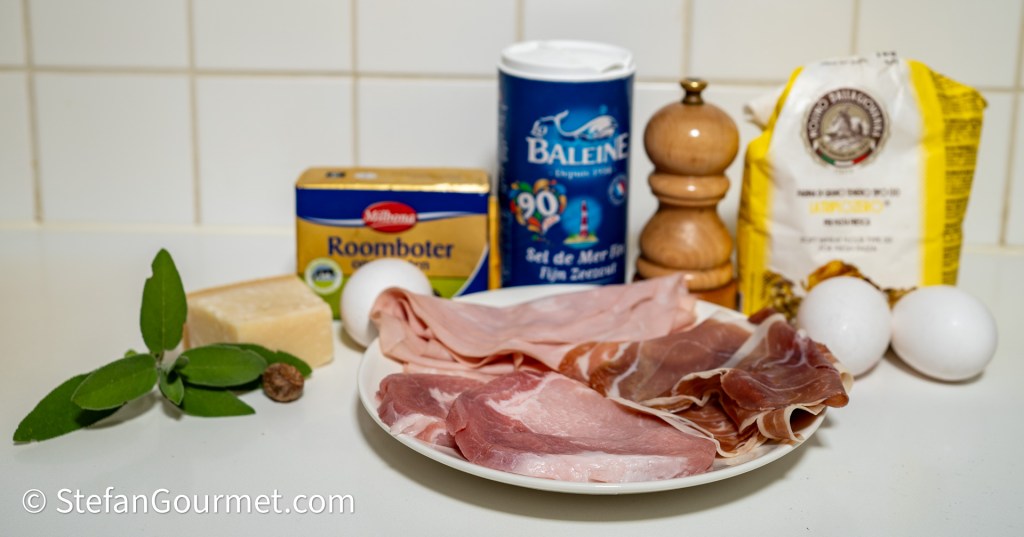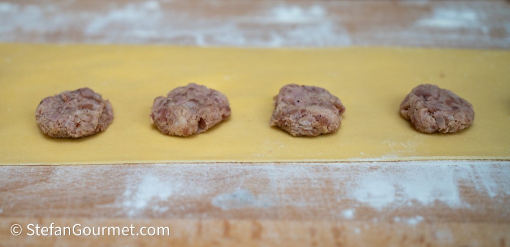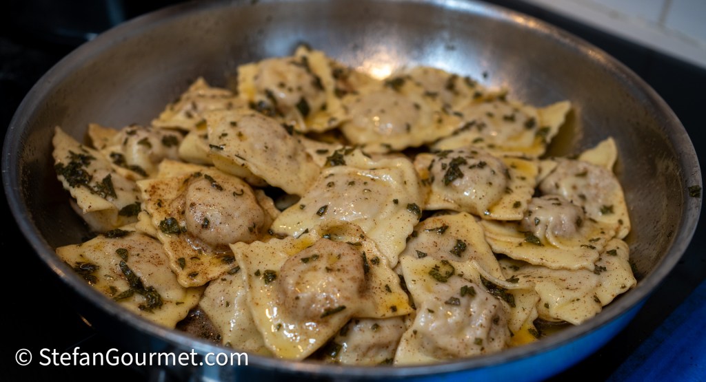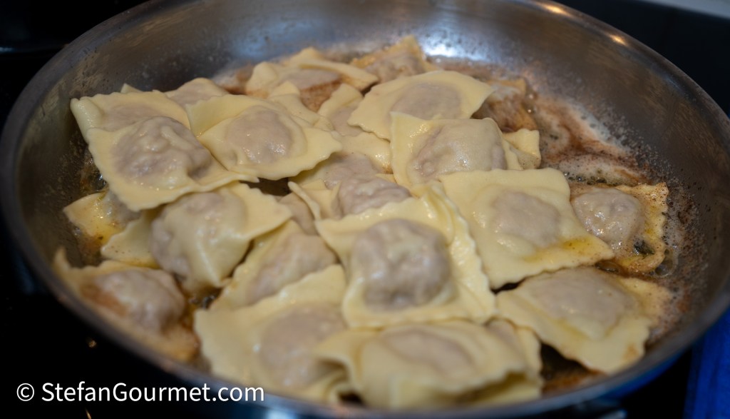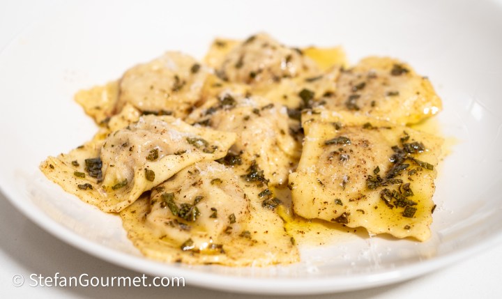 This ravioli dish is one of my favorite ‘battle horses’, an Italian term (cavallo di battaglia) for a dish that is always a success when I prepare it for guests. I also prepared this for my friends Robert and Melvin when they came over for dinner for the first time in early 2011. Robert liked these ravioli so much that they brought tears to his eyes, and from then on these ravioli are referred to as “cry ravioli”. The filling is the same as tortellini from Bologna, which are usually served in a meat broth, or with ragù. Here I’ve made ravioli instead of tortellini (larger and less work), and serve them with a simple but delicious sauce of butter and fresh sage. The recipe has been on my blog since 2012, but it was one of five ravioli recipes in this post and therefore somewhat hard to find. As these ravioli are so good, it is time to give them their own post. There is only one thing that I have improved since then, and that is to sear the pork before dicing it. This makes it much easier to brown the pork, as you can turn a whole slice of pork at once rather than having to turn all those cubes, and cubed pork releases more juices, making it more difficult to sear rather than boil the pork.