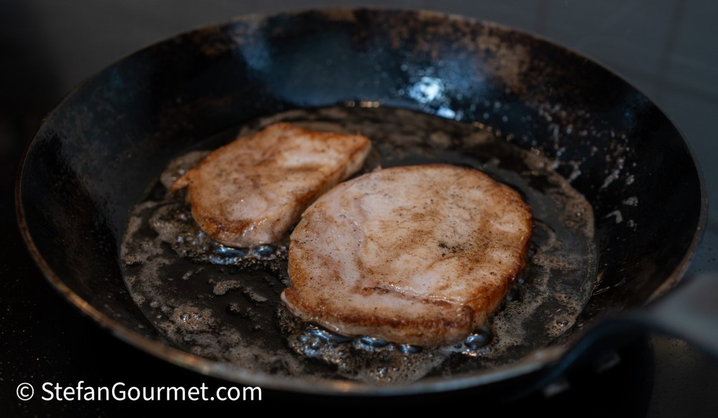 To make the filling, melt 1 tablespoon of butter in a small frying pan. Pat the pork loin dry with paper towels, and sear the pork on both sides over medium-high heat. This is mostly to develop the flavor, but also to cook the pork.